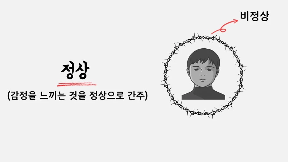 가령 역사적으로 아주 오랫동안 비정상이라 여겨진 성소수자들을 비정상이라고 박해한 세력은 절대다수의 이성애자들이 살아가는 세계, 즉 정상 세계입니다. 비정상 세계가 명확해질수록 정상 세계는 진실로 정상적이라는 당위성이 생기니 말이죠. 이러한 관점에서 정상인이란 정상인이기 때문에 정상인인 것이 아니라, 비정상인이 아니기 때문에 정상인일 수 있다는 논리가 성립하는 것입니다. 따라서 윤재를 비정상으로 규정하는 권력은 감정을 느끼는 것만을 멀쩡한 것이라 여기는 정상 세계로부터 나온 거라 할 수 있죠.