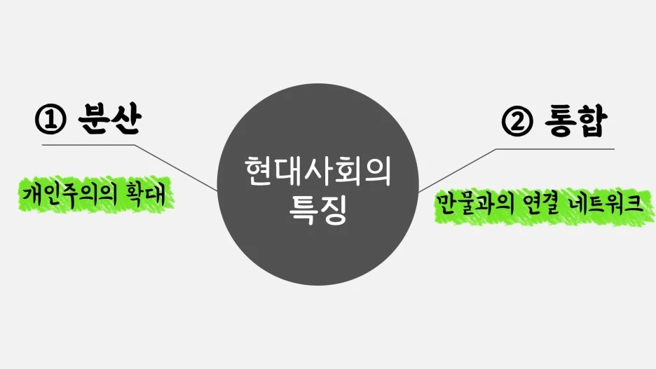 저자에 따르면 현대 사회의 두 가지 큰 특징은 분산과 통합입니다. 먼저 분산이란 개인주의의 확대를 뜻하는데요. 예컨대 오늘날 현대인은 국가 권력에 일방적으로 굴복 당하지 않는 시민으로서의 권리를 마땅히 누릴 수 있고요, 또한 개인 SNS 채널 등을 바탕으로 사회에 강력한 영향력을 발휘하기도 합니다. 뿐만 아니라 1인 가구의 증가와 더불어 혼자 시간을 보내는 것에 익숙한 개인들이 늘어났죠. 이처럼 현대 사회에서 개인은 혼자서 무엇이든 할 수 있는, 마치 자기만의 왕국을 다스리는 독립된 존재로 여겨집니다. 둘째로 통합이란 통신 및 과학 기술의 발달과 더불어 인간과 만물의 연결을 가능하게 만드는 강력한 네트워크를 뜻합니다. 즉 사람과 사람 간의 소통을 넘어 사람과 사물, 심지어는 사물과 사물이 서로 데이터를 주고받는 이른바 만물 인터넷 시대가 도래한 거죠.