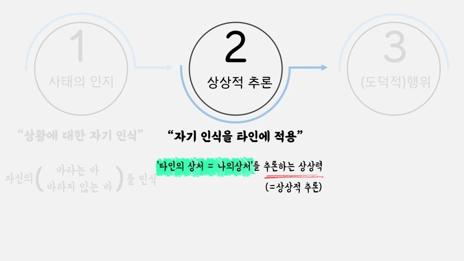 인간이 도덕적 행위를 실천하기 위해서는 앞서 인식한 자신이 바라는 것, 혹은 바라지 않는 것을 타인의 입장에 적용하기 위해서 상상력을 발휘해야만 한다는 내용인데요. 중요한 내용인 만큼 한 번 예를 들어보겠습니다. 일례로 우리는 타인으로부터 비난을 듣거나 상처 받길 바라지 않습니다. 하지만 반대로 우리는 때때로 타인을 비난하며 상처를 주기도 하죠. 그 이유는 전적으로 ‘나’와 타인이 분리된 존재이기 때문입니다. 타인의 상처는 결코 나의 상처가 아니므로 나 자신을 대하는 것처럼 타인을 섬세하게 대할 필요가 없는 거죠. 즉 우리가 도덕적 행위를 실천하기 위해 필요한 것은 타인의 상처를 나의 상처라고 상상할 수 있는, 나아가 타인도 나처럼 상처를 두려워하는 존재라고 추론할 수 있는 상상적 추론 과정입니다.