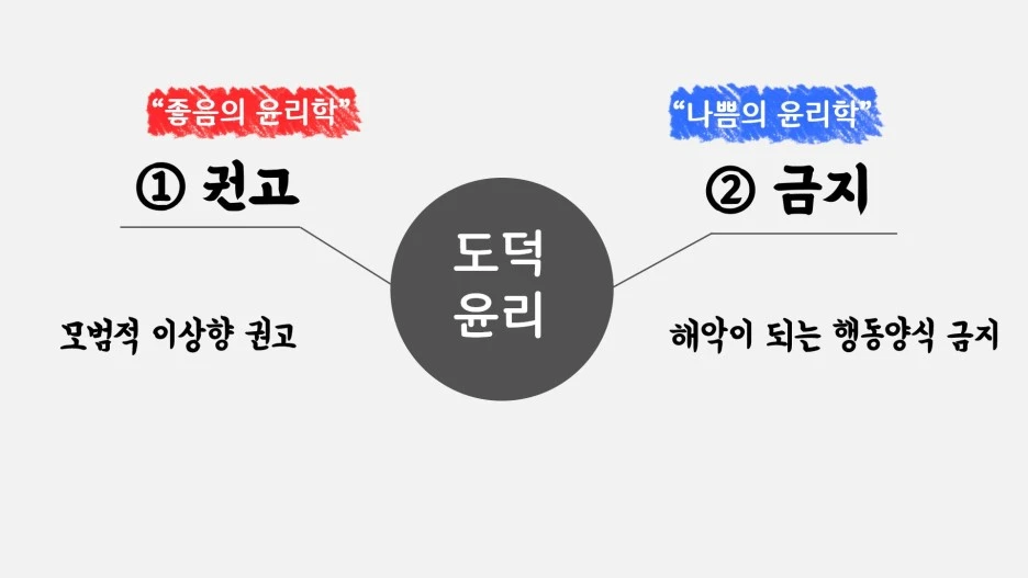 인간 사회의 도덕은 크게 두 가지로 구분할 수 있습니다. 모범적인 이상향을 권고하는 도덕과, 공동체에 해악이 되는 내용을 금지하는 도덕으로서, 이른바 ‘좋음의 윤리학’과 ‘나쁨의 윤리학’이라 할 수 있죠.
