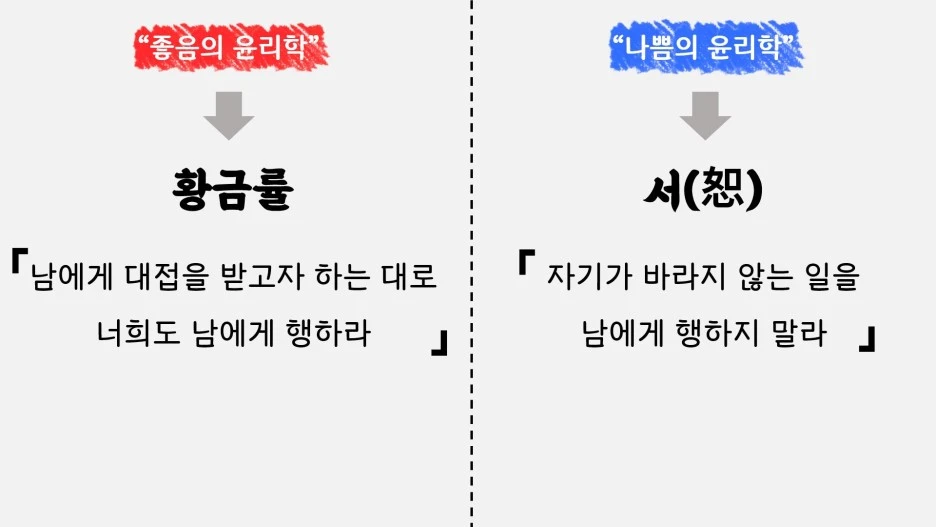 이 둘을 앞서 살펴본 개념에 적용해본다면, 좋음의 윤리학이란 내가 좋다고 여기는 바를 타인에게도 베풀고자 하는 황금률에 대응하며, 나쁨의 윤리학이란 내가 싫어하는 바를 타인에게 행하지 않으려는 서에 대응합니다.