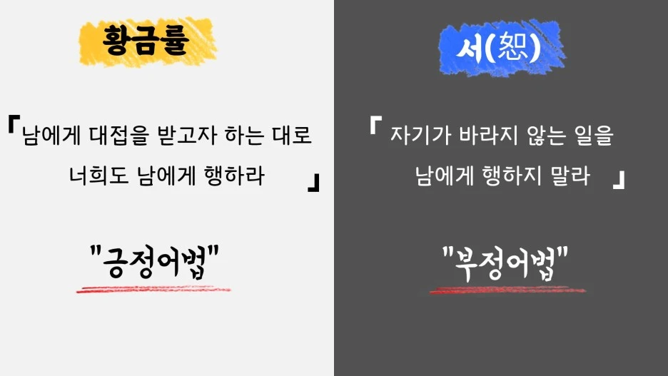 성경은 다음과 같이 말합니다. “남에게 대접을 받고자 하는 대로 너희도 남을 대접하라.” 즉 남들로부터 인정받고 싶은 사람은 먼저 타인을 인정해주며, 또한 사랑받고 싶거든 나부터 타인을 사랑하라는 말씀이죠. 그리스도교 전통에서는 이 성경구절을 가리켜 ‘황금률’이라 부릅니다. 말 그대로 황금처럼 귀한 잠언, 즉 인간의 도덕 윤리를 구성하는 핵심 원리에 해당하는 말씀이라 여겼던 거죠. 그런데 흥미롭게도 이러한 황금률은 고대 중국에서도 비슷하게 반복되었습니다. 바로 공자가 제안했던 ‘서(恕)’라는 개념인데요. 그가 말하는 ‘서’란 ‘자기가 바라지 않는 일을 남에게 행하지 않는 것’을 가리킵니다. 즉 앞서 소개한 황금률이 ‘내가 바라는 것’을 타인에게도 ‘베풀라’는 긍정 어법인데 반해 공자가 말하는 ‘서’란 ‘내가 바라지 않는 것’을 타인에게 ‘베풀지 말라’는 부정 어법이라 할 수 있죠.