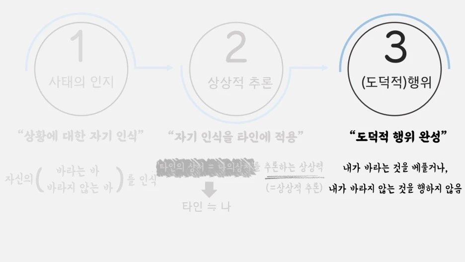 황금률과 서는 각각 긍정과 부정이라는 외견상 다른 형태를 취하지만 공통적으로 세 단계의 진행 과정을 요구합니다. 첫째로 사태의 인지와, 둘째로 상상적 추론, 그리고 마지막 도덕적 행동으로 마무리되는 과정이죠.