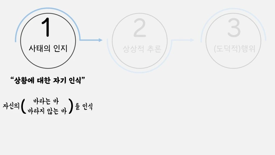 먼저 사태의 인지란 말 그대로 상황에 대한 자기 인식을 뜻합니다. 예컨대 황금률을 실천하는 주체는 먼저 자기 자신이 바라는 바가 무엇인지를 인식해야 하며, 마찬가지로 서를 실행하는 주체는 자기가 바라지 않는 바가 무엇인지를 인식해야 하겠죠. 중요한 것은 그 다음 단계입니다.