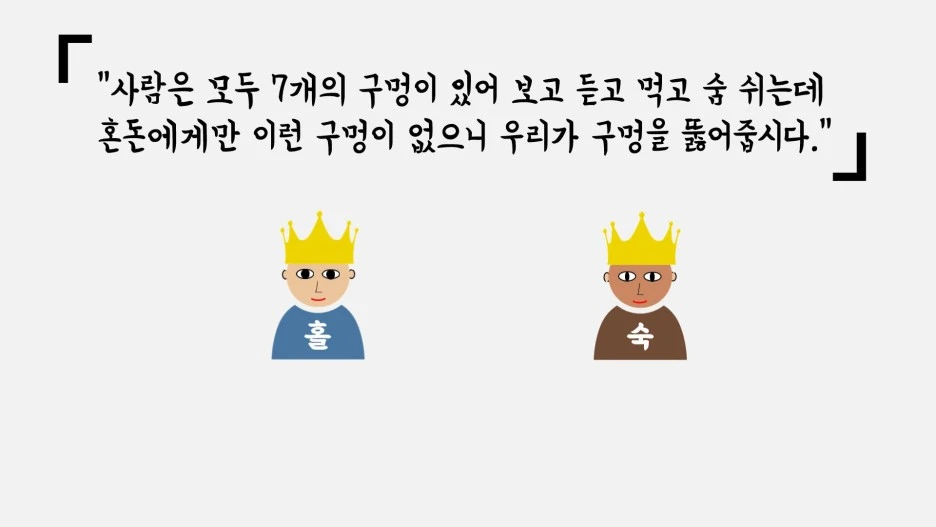 이러한 도덕적 상상력을 발휘하는 데 성공한 주체는 내가 바라는 것을 상대에게 베풀거나, 혹은 내가 바라지 않는 것을 상대에게도 행하지 않음으로써 도덕적 행위를 완성할 수 있는 거죠. 하지만 이 과정에는 매우 위험한 가능성이 도사리고 있습니다. 인간의 도덕적 상상력은 얼마든지 틀릴 가능성이 있다는 사실이죠. 이를 잘 설명하는 훌륭한 사례 중 하나가 장자에 실린 혼돈칠규라는 이야기입니다. 이야기의 내용은 이렇습니다. 먼 옛날 북해의 제왕 홀과, 남해의 제왕 숙, 그리고 중앙의 제왕 혼돈이 있었습니다. 때때로 그들은 혼돈의 땅에 모여 시간을 보내곤 했고, 때마다 혼돈은 숙과 홀을 맞아 지극히 잘 대접했죠. 이에 숙과 홀은 혼돈의 덕에 보답하기 위한 지혜를 모았고, 그 결과 그들은 다음의 결론에 가닿았습니다.