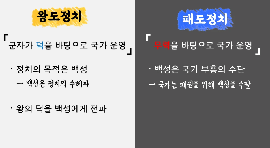 맹자는 왕도정치를 꿈꿨습니다. 왕도정치란 끝없는 수양을 통해 마침내 대장부의 경지에 오른 군자가 덕을 바탕으로 국가를 지도하는 정치 형태를 가리키는 것으로 강력한 무력을 바탕으로 국가를 지도하는 패도정치와 대조를 이루는데요. 먼저 왕도정치의 경우 정치의 목적은 백성으로서, 즉 백성은 정치의 수혜자가 되어야 한다는 전제가 있습니다. 따라서 왕도정치 체제의 왕에게 있어 국가 경영의 목적이란 자신의 덕을 백성들에게 골고루 퍼트리는 것이라 할 수 있죠. 반면 패도정치에서 백성이란 목적이 아닌 수단입니다. 다시 말해 왕은 강력한 패권을 쥐기 위해 보다 넓은 영토를 차지하고자 백성들을 전쟁으로 내몰거나 수탈하는 등 얼마든지 백성을 이용할 수 있죠. 맹자는 그러한 패도정치를 신랄하게 비난하며 오로지 의로움을 앞세우는 왕도정치만이 올바른 정치 형태라고 강력히 주장했던 것입니다.