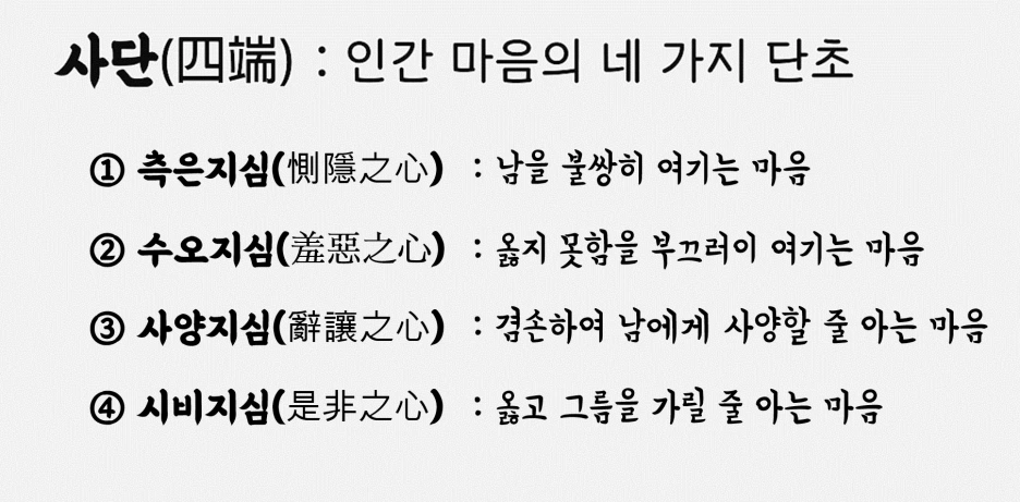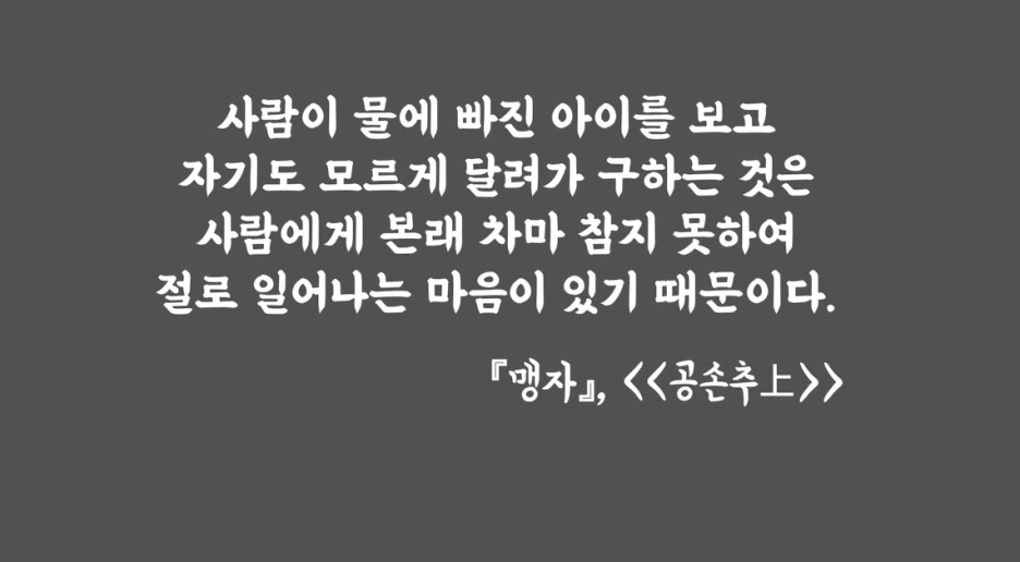 예부터 동양의 철학자들은 인간의 본성에 대하여 뜨거운 논쟁을 벌여왔습니다. 그 결과 성선설, 성악설, 성무선무악설, 성선악혼재설, 성삼품설 등 다양한 인성론이 자리잡게 되었죠. 익히 알려져 있듯 맹자는 그 중 성선설을 주장했습니다. 다시 말해 맹자는 인간의 본성이 본래 선하다고 이야기했던 건데요. 과연 그 근거는 무엇이었을까요? 이에 대해 맹자는 사단을 제시합니다. 사단이란 말 그대로 우리 마음의 네 가지 단초를 뜻하는 것으로 인간이라면 누구나 갖지 않을 수가 없는 다음의 네 가지 마음을 나타내죠. 각각을 풀이하면 측은지심이란 남을 불쌍히 여기는 마음, 수오지심이란 자신의 옳지 못함을 부끄러이 여기는 마음, 사양지심이란 겸손하여 남에게 사양할 줄 아는 마음, 끝으로 시비지심이란 옳고 그름을 가릴 줄 아는 마음을 가리킵니다. 맹자는 그 중에서도 우물에 빠지려 하는 아이를 발견했을 때 우리의 마음 속에 곧바로 측은지심이 생기는 것을 근거로 인간의 본성이 선하다고 이야기했죠.