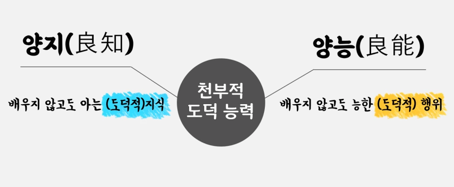사덕을 간단히 소개하면 첫째로 ‘인’이란 남을 불쌍히 여기며 타인의 고통을 마치 나의 고통처럼 느끼는 측은지심의 열매라 할 수 있고요. 둘째로 ‘의’는 옳지 못함을 부끄러이 여기며 자기 마음에 당당한 길만 걸어가려는 수오지심의 열매라 할 수 있습니다. 셋째로 예는 겸손하여 사양할 줄 아는 사양지심을 행동으로 실천하여 그것이 우리 삶의 예절로서 열매 맺은 것이고요, 끝으로 ‘지’는 옳고 그름을 분별하는 시비지심을 성실히 수행한 결과로서 얻어질 수 있는 것입니다. 따라서 맹자가 말하는 성선설의 진정한 의미는 인간이 이미 선한 존재로서 완성되어졌다는 것이 아니라 선한 존재가 될 수 있는 잠재력을 가진 것이라고 이해할 수 있습니다. 다시 말해 우리 내면의 사단을 올바로 꽃피우지 못한 인간은 아직 선한 존재라고 불리울 수 없다는 이야기입니다. 이 밖에도 맹자는 성선설의 근거로 양지와 양능을 추가합니다. 양지란 배우지 않고도 아는 지식을 뜻하며, 양능이란 배우지 않고도 능한 행위를 가리키는데요. 가령 우물에 빠진 아이를 도와야 한다는 지식은 배우지 않아도 알 수 있는 양지이며, 나아가 아이를 구하고자 뛰어드는 행위 역시 배우지 않아도 행할 수 있는 양능이라 할 수 있죠.