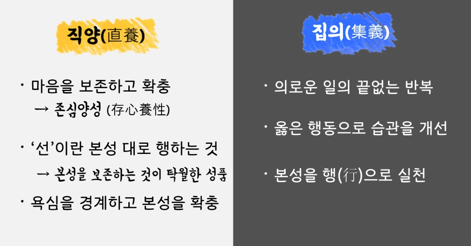 즉 맹자는 사단과 사덕, 양지와 양능을 통하여 인간이 본래 선을 지향하는 존재라고 주장하는 것입니다. 만약 인간이 악을 저지른다면 그것은 곧 사단을 꽃피우지 못한 결과라 할 수 있죠. 그렇다면 인간은 대체 어떠한 수양을 통해 사덕이라는 열매를 맺을 수 있을까요?