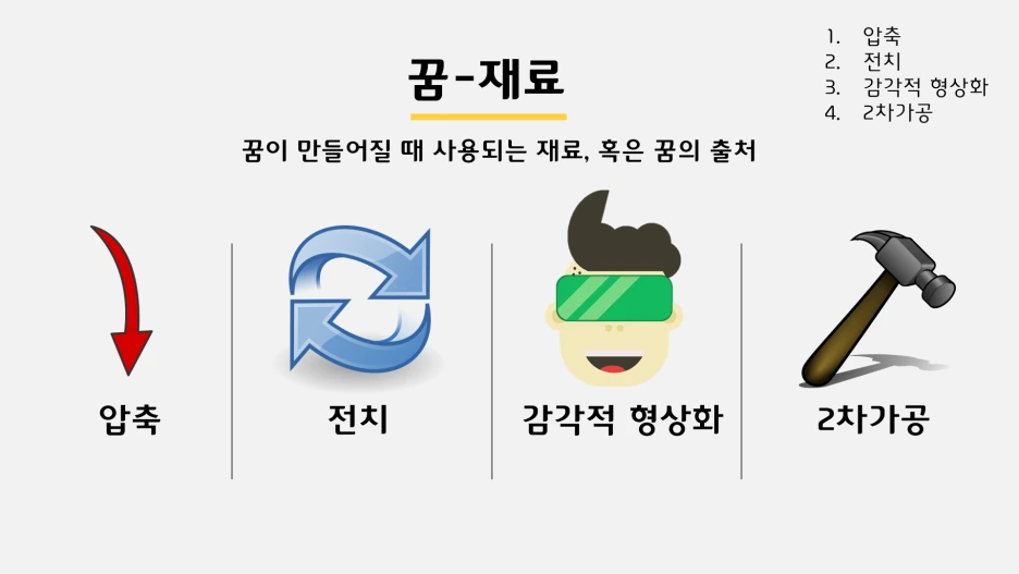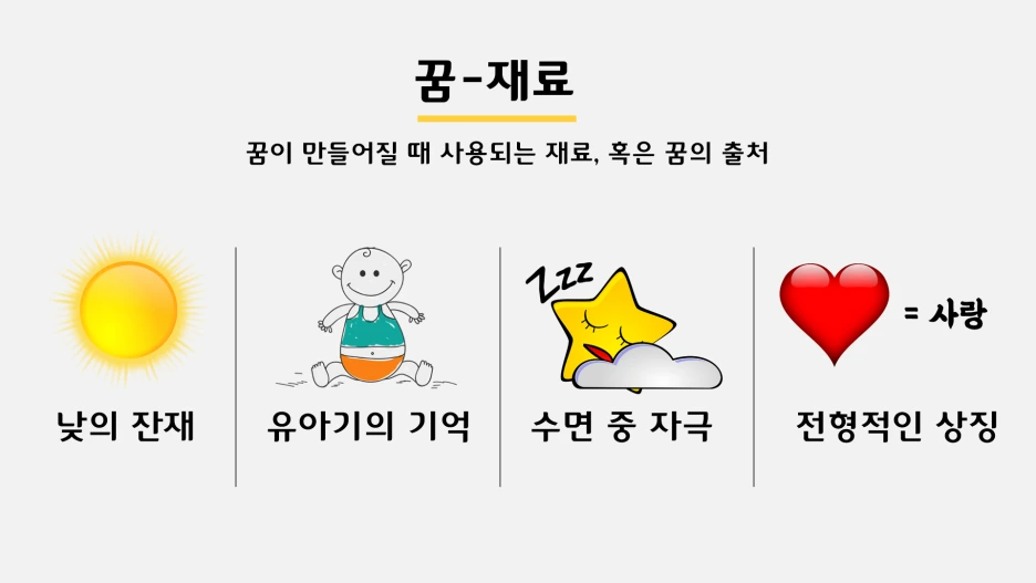 꿈-재료란 말 그대로 꿈이 만들어질 때 사용되는 재료를 뜻하는 것으로 프로이트는 다음의 네 가지를 제시합니다.