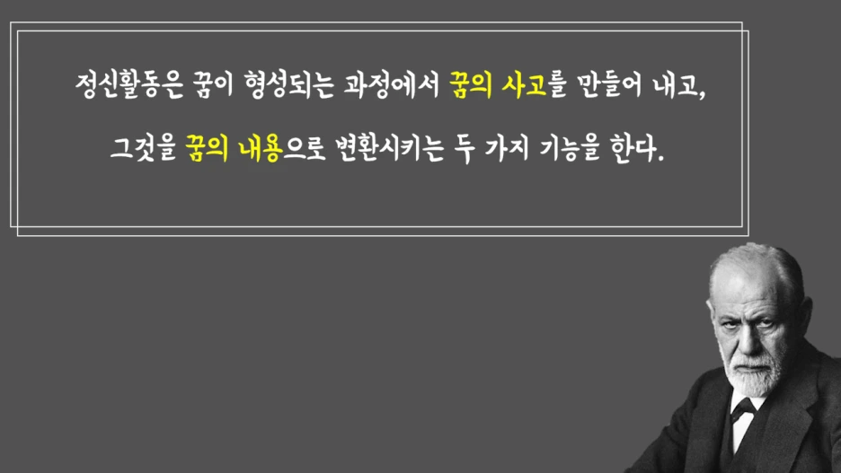 여기서 주목할 개념은 꿈의 사고와 꿈의 내용입니다. 먼저 꿈-사고란 억압된 욕망을 실현하고자 하는 잠재적 꿈을 뜻하는 것으로 쉽게 말해 꿈의 주제라고 할 수 있고요, 꿈-내용이란 우리가 실제로 기억하는 꿈의 내용을 가리키죠. 한 번 예를 들어보겠습니다. 한 아이가 수업 시간에 선생님께 질문을 하고 싶은데 용기가 나지 않아 손을 들지 못했습니다. 이때 아이는 자신이 좀 더 자신감 넘치는 성격을 가졌으면 좋겠다고 속으로 생각하죠. 그날 밤 아이는 수많은 사람들 앞에서 연설하는 꿈을 꿉니다. 아이는 꿈속에서나마 소원을 성취할 수 있었던 거죠. 이 경우 아이의 꿈-사고는 자신감 넘치는 성격을 갖고 싶다는 욕망이며, 또한 꿈-내용은 많은 사람들 앞에서 자신감 있게 연설하는 이미지 그 자체입니다. 쉽게 말해 꿈-내용은 우리가 꿈속에서 경험하는 한 편의 이야기이고, 꿈-사고는 그 이야기 속에 담긴 주제라 할 수 있죠. 프로이트에 따르면 인간의 정신활동은 여러가지 재료를 통해 꿈-사고를 꿈-내용으로 바꾼다고 합니다. 이때 사용되는 꿈의 재료를 꿈-재료라 부르며 꿈-사고를 꿈-내용으로 바꾸는 과정을 가리켜 꿈-작업이라 합니다.
