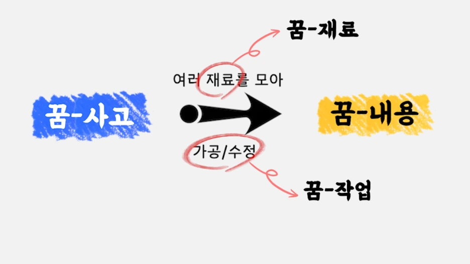 앞서 살펴본 내용을 잠시 정리하면 인간의 꿈은 두 가지 층위로 나눠 볼 수 있었습니다. 꿈속에서 우리가 실질적으로 기억하는 꿈-내용과, 그 이야기 속에 담긴 무의식적 욕망이라 할 수 있는 꿈-사고로 말이죠. 다시 말해 인간의 꿈은 꿈-사고가 꿈-내용의 형태로 드러난 것이라 할 수 있는데요. 이처럼 꿈-사고를 꿈-내용으로 바꾸는 과정을 가리켜 꿈-작업이라 합니다. 그 과정에서 활용되는 재료를 꿈-재료라 하는 거죠. 프로이트에 따르면 꿈-작업은 다음과 같습니다.