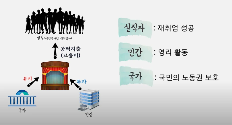뿐만 아니라 기업내 사고율은 41%나 감소했고, 1929년 대비 39% 더 많은 사람들이 일하게 되었다고 하죠. 따라서 리프킨은 노동이 사라질 수록 노동의 공유가 필요하다고 주장하는 것입니다. 이어서 두번째 대안은 제3부문의 확충입니다. 제3부문이란 국가의 공공적 목적과 민간의 영리적 목적 그 중간에 위치한 것으로, 쉽게 말해 국가가 특정 사업을 유치하고 투자는 민간으로부터 받아서 운영하는 사업을 예로 들 수 있습니다. 가령 국가에서 실직자들로 꾸려진 연극 사업을 유치한다고 하면, 이에 대한 투자를 민간으로부터 받아 운영하되 사업을 통해 발생한 이익의 일부를 공공 목적으로 사용할 수 있는 식이죠. 이때 실직자들은 재취업에 성공할 수 있고, 민간은 영리를 취할 수 있을 것이며, 국가는 국민의 노동권을 보장하는 공공적 역할을 성취할 수 있을 것입니다.