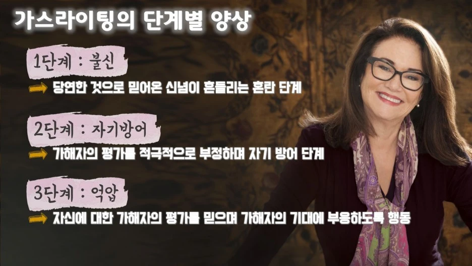 로빈 스턴에 따르면 가스라이팅은 크게 세 단계—불신, 자기방어, 억압—의 양상으로 드러납니다.
