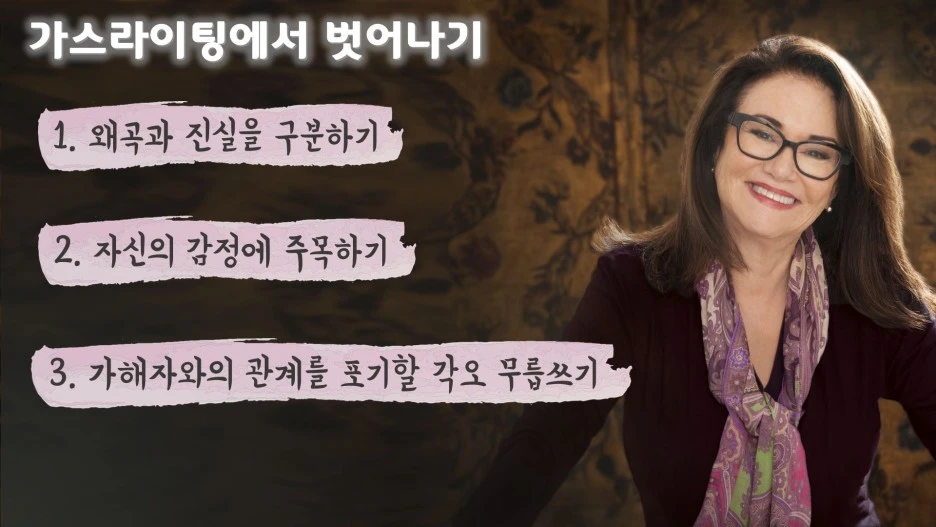 가스라이팅을 벗어나는 첫 번째 방법은 왜곡과 진실을 구분하는 것입니다. 사실 가스라이팅의 초기 단계만 하더라도 피해자들은 가해자의 발언이 사실이 아니라는 점을 잘 알고 있습니다. 다만 피해자들은 상대방과 헤어지는 것이 두려운 나머지 가해자를 공감하게 되고 급기야 그들의 이야기를 사실로 믿고 싶은 유혹에 빠지게 되는 거죠. 따라서 피해자들은 가해자로부터 비난에 시달릴 때 그것이 진실인지 아닌지를 먼저 구별해야 하며, 만약 진실이 아니라면 절대 가해자에게 동조하지 않도록 주의를 기울여야 합니다. 두 번째 방법은 자신의 솔직한 감정에 집중하는 것입니다. 때때로 피해자들은 가해자의 입장에 지나치게 이입하여 정작 자신의 감정을 외면하곤 합니다. 이를테면 매일 밤 남편으로부터 가정 폭력을 당하는 아내가 도리어 남편을 동정하며 그의 입장을 변호하는 것처럼 말이죠. 마찬가지로 가스라이팅 피해자들은 가해자에게 필요 이상으로 공감하는 반면 자신의 감정이 상하는 것엔 둔감한 경향이 있습니다. 모든 책임을 피해자 본인에게로 돌리며 가해자가 자신의 감정을 상하게 한 것은 피해자 본인의 탓이라고 받아들이는 식이죠. 따라서 가스라이팅의 피해자가 되지 않기 위해선 옳고 그름의 문제를 떠나 자신의 느낌과 감정에 주목하는 훈련이 필요합니다. 자고로 건강한 관계는 서로의 잘잘못을 따지기보다 수용과 용서, 그리고 화해가 필요하기 때문이죠.