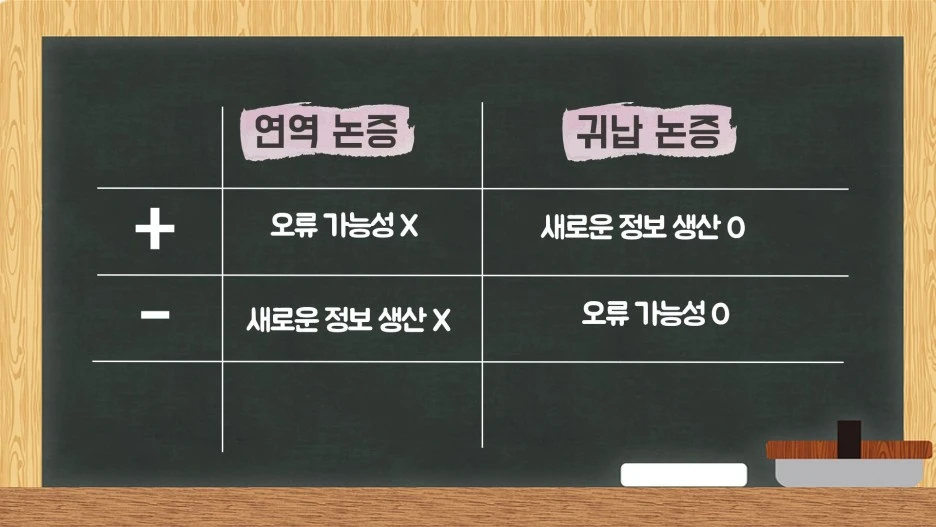 이를 통해 우리가 알 수 있는 교훈은 귀납 논증의 경우 아무리 전제가 많더라도 결론을 필연적으로 보장할 수는 없다는 것입니다. 실제로 이러한 이유 때문에 과거엔 연역 논증이 우세했습니다. 고전 논리학에서는 확실하지 않은 사실을 말하는 것보다 필연적으로 사실인 것만 말하는 것이 진리라고 여겨졌기 때문이죠. 하지만 사실 연역 논증의 결론이 필연적일 수 있는 이유는 애초에 결론이 전제에 포함되어 있는 구조이기 때문입니다. 가령 ‘소크라테스는 죽는다’라는 결론이 ‘사람은 죽는다’라는 전제에 포함되는 것처럼 말이죠. 다시 말해 연역 논증은 우리가 전제를 통해 이미 알고 있는 사실을 반복하는 것에 지나지 않습니다. 반면 귀납 논증의 결론은 비록 거짓일지도 모르지만 대신 우리가 알지 못했던 새로운 정보라는 점에서 큰 가치가 있죠. 따라서 연역과 귀납의 장단점을 정리하면 다음과 같습니다.