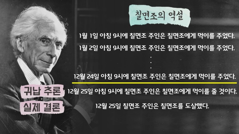 앞서 소개했듯 귀납 논증은 전제가 결론을 개연적으로 뒷받침하는 논증입니다. 따라서 귀납 논증은 전제가 참일 경우 결론 또한 참일 가능성이 크지만 100%는 아니라는 이야기이죠. 어쩌면 이러한 사실은 귀납 논증의 한계일지도 모릅니다. 대표적인 예로 칠면조의 역설이라는 버트런드 러셀의 예시를 살펴보겠습니다. 예컨대 칠면조를 기르는 한 사람이 1월 첫째 날 아침 9시에 칠면조에게 먹이를 줍니다. 주인은 그러한 행동을 12월 24일까지 거의 1년 동안 지속합니다. 이 경우 우리가 칠면조의 입장에서 추론을 해본다면 12월 25일에도 주인은 역시나 동일한 행위를 반복할 것이라 예측할 수 있겠죠. 하지만 유감스럽게도 주인은 크리스마스에 가족과 칠면조 요리를 먹기 위해 12월 25일 칠면조를 도살했습니다. 이로써 칠면조의 귀납적 추론은 비극적인 실패로 마무리된 거죠.