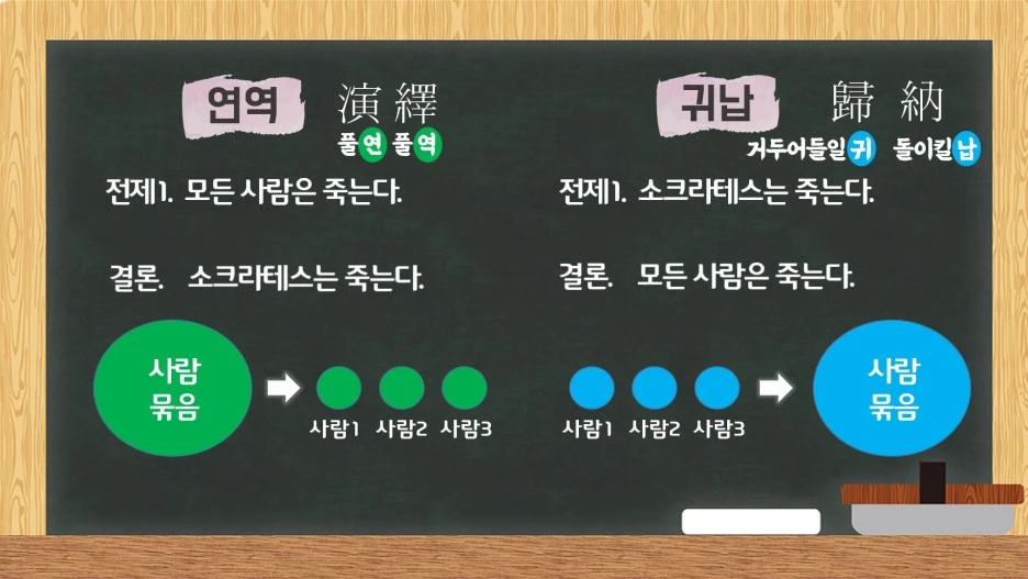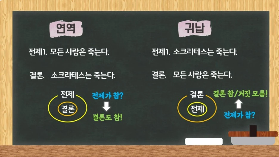 부수적인 전제들을 제거하여 논증을 단순화하면 두 논증의 추론 방식이 정반대라는 사실이 확연히 드러납니다. 두 논증은 전제와 결론이 서로 뒤바뀐 모양을 이루고 있죠. 여기서 주목할 점은 전제와 결론의 포함 관계입니다. 자명하게도 소크라테스라는 한 사람은 사람 집합에 포함되는 하나의 원소에 불과하죠. 따라서 연역 논증의 결론은 전제에 포함되는 명제이며 귀납 논증의 결론은 전제의 범위를 넘어서는 명제입니다. 따라서 연역 논증은 전제가 참이라면 결론도 참일 수밖에 없으며, 반면 귀납 논증은 전제가 참이라 해서 결론 또한 참일 거라는 보장이 없죠. 이러한 의미 차이는 연역과 귀납의 한자어에도 잘 담겨 있습니다.