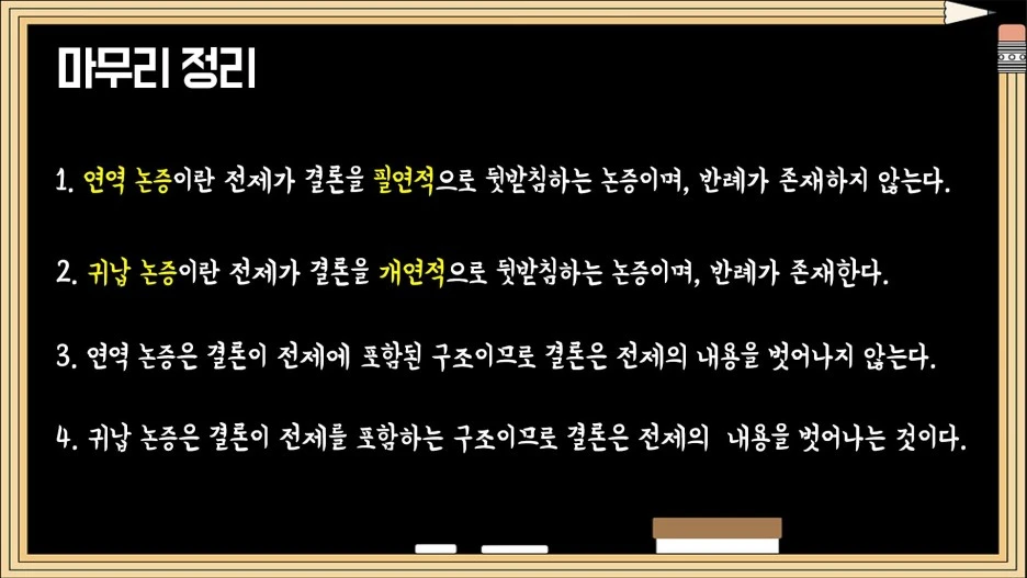 따라서 내용을 정리하면 이렇습니다. 연역이란 전제가 결론을 필연적으로 보장하는 논증이며, 귀납이란 전제가 결론을 개연적으로 보장하는 논증이라고 말이죠. 그렇다면 이제 두 논증을 비교해보겠습니다.