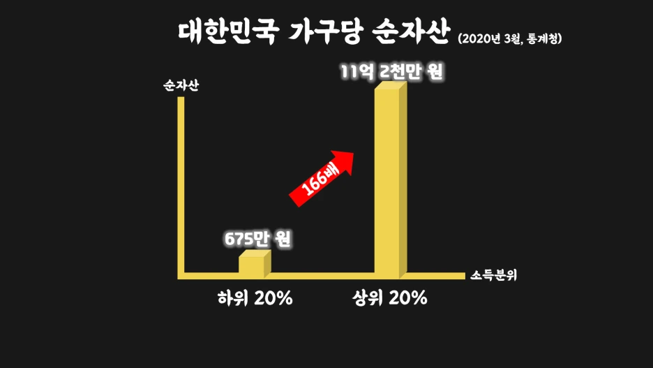 저자에 따르면 오늘날 우리 사회의 부는 무척이나 <편중>되어 있습니다. 가령 2020년 3월 기준 대한민국의 가구당 순자산은 상위 20%가 평균 11억 2천만원, 하위 20%가 평균 675만원으로, 무려 166배에 달하는 격차를 보인 바 있습니다(통계청).