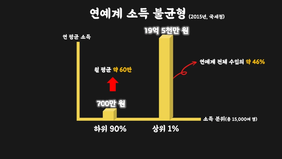 저자는 이러한 극단적인 양극화 현상의 원인을 승자 독식 현상으로부터 찾습니다. 승자 독식이란 말 그대로 각 분야의 <승자>들이 부를 독식하는 현상을 가리킵니다. 일례로 <연예계>의 경우를 살펴보면, 2015년 ‘탤런트’로 수입 신고를 마친 만 오천여 명 중 상위 1%의 연평균 수익은 약 19억 5천만원, 하위 90%는 약 700만원이라고 합니다. 즉 상위 1%(154명)가 전체 수입의 약 46%를 차지하는 반면 하위 90%의 수익은 한 달 평균 약 60만원 불과한 수준이죠(국세청, 2015).