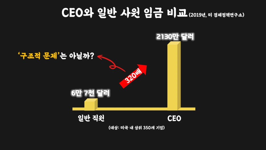 이러한 현상은 비단 연예계에만 국한되지 않습니다. 스포츠계와 법조계, 의료계, 심지어는 교육계에서도 소수의 <승자>가 전체 소득의 대부분을 차지하고 있죠. 하지만 여기서 우리는 한 가지 의문을 제기할 수 있습니다. 자유로운 경쟁이 허락된 사회에서 <승자>가 더 많은 보상을 차지하는 것은 능력주의에 따른 자연스러운 결과가 아닐까요? 요컨대 1등은 그 누구보다 많은 노력을 기울였으므로, 따라서 1등이 가장 많은 보상을 차지하는 것은 합리적이라는 발상입니다. 그러나 저자에 따르면 승자 독식은 <능력주의>로만 설명하기에는 다소 지나친 구석이 있습니다. <승자>가 받는 보상은 그의 능력에 비해 다소 과잉된 측면이 있으며, 또한 <패자>가 받는 보상은 그의 능력에 비해 때때로 모자란 측면이 있기 때문이죠. 예컨대 미 경제정책연구소(EPI)에 따르면 2019년 미국의 상위 350개 기업 CEO들의 평균보수(2130만 달러, 252억원)는 일반 직원(6만 7천 달러, 7900만원)과 비교해 무려 320배에 달하는 것으로 밝혀진 바 있습니다.