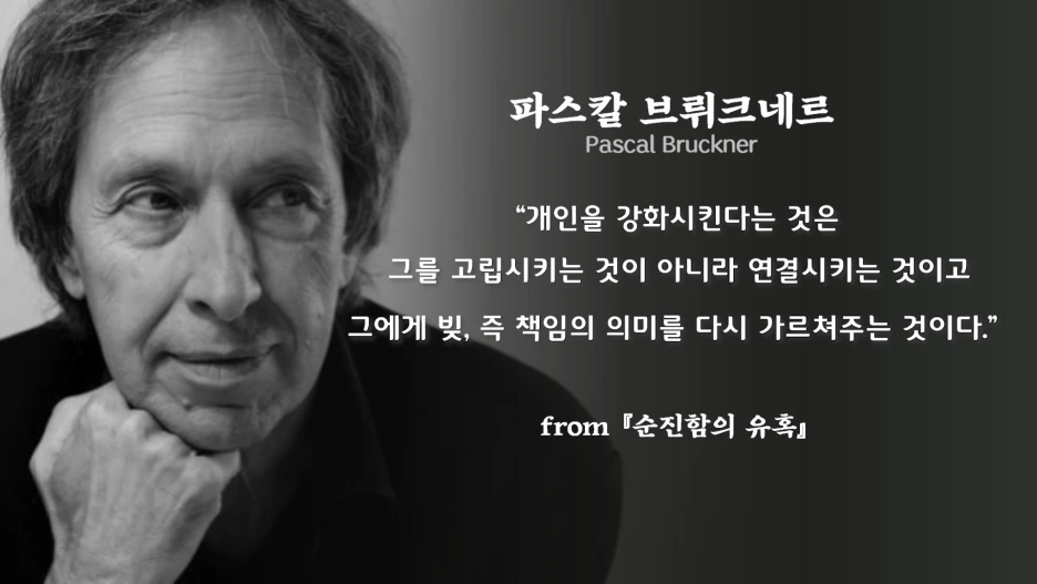 다시 말해 인간은 타자와의 관계로부터 결코 자유로울 수 없는 존재입니다(“인간의 삶은 근본적으로 부채의 삶이면서 기부의 삶이다”, 『분노사회』, 정지우). 사람과 관계 맺기 싫어 집 안에만 칩거하는 사람조차 실은 타인이 수확한 열매를 통해 생명을 유지하는 법이죠. 따라서 현대적 개인주의의 방향성은 타자와의 관계를 청산하는 것이 아니라, 타자와의 관계를 재설정하는 것이 되어야 합니다. 요컨대 우리는 <집단>을 해체하고 그 자리에 <연대>를 재건해야 합니다. 가령 집단 속의 인간이 <역할>을 강요 받는 수동적 존재라면, 연대 속의 인간은 <책임>을 발휘하는 능동적 존재이죠. 따라서 우리는 문화 발전에 기여할 의무, 정치 참여의 의무 등 타자와 사회에 대한 거룩한 책임을 완수함으로써 우리 사회의 분노를 덜어내는 데 실제적인 기여를 할 수 있을 것입니다.