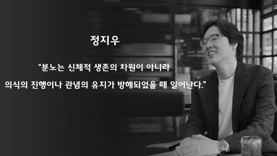 따라서 우리는 타인을 향한 시기어린 시선을 거두고 자신의 내면으로 눈길을 돌리는 자기서사의 의무를 시작해야만 할 것입니다. 다음으로 두번째 유형은 <집단으로의 도피>입니다. 이는 자기 내부에서 정체성을 형성하지 못한 사람들이 결국 집단의 정체성에 몰입하게 되는 현상을 가리키죠. 즉 자기만의 관념이 부족한 나머지 집단의 관념을 내면화하고 마는 것입니다. 다만 여기서 문제점은 대부분의 경우 많은 집단들이 다른 집단을 혐오함으로써 존재감을 드러낸다는 것입니다. 마치 근대 유럽 국가들의 민족성이 나폴레옹의 침공과 함께 생겨난 것처럼(“근대 유럽 국가에서 각 국가의 민족성은 나폴레옹의 침공과 함께 생겨났다”, 『분노사회』, 정지우) 집단의 정체성 역시 외부를 배제함으로써 내부를 확립할 수 있는 것입니다. 일례로 현대 한국 정치 지형의 극우 및 극좌 세력들은 생산적인 토론과 합의를 실행하기보다 상대진영을 혐오함으로써 뚜렷한 존재감을 드러내려 합니다. 즉 내부에서 이상적인 정치 담론을 생산하기보다 바깥 세력을 배격함으로써 정체성을 형성하는 것이죠. 그런 의미에서 한국의 수많은 집단들은 크고 작은 분노를 공유하는 분노 공동체라 할 수 있습니다. 끝으로 세번째 유형은 개인주의적 분노입니다. 이는 앞서 살펴본 집단주의에 대한 반향으로 근래의 젊은 세대로부터 시작된 분노입니다. 현대 한국 사회에서 비교적 젊은 세대에 속하는 사람들은 집단의 규율에 대한 무조건적인 복종을 거부합니다. 예컨대 그들은 상명하복으로 대표되는 군대문화나, 수직적 위계질서를 고수하는 기업문화, 혹은 가부장적인 가정문화 등에 대해 회의적입니다. 개인의 역할이 집단 속에서 획일적으로 규정되는 것을 납득할 수 없기 때문이죠. 다시 말해 그들은 무엇보다도 개인의 가치가 훼손될 때 강력한 분노를 드러냅니다. 이를테면 언론의 자유나 민주주의, 혹은 경쟁의 공정성과 같은 개인의 보편적 가치 실현에 보다 큰 관심을 갖죠. 그렇다면 우리는 이러한 현대적 분노를 어떻게 다스릴 수 있을까요?