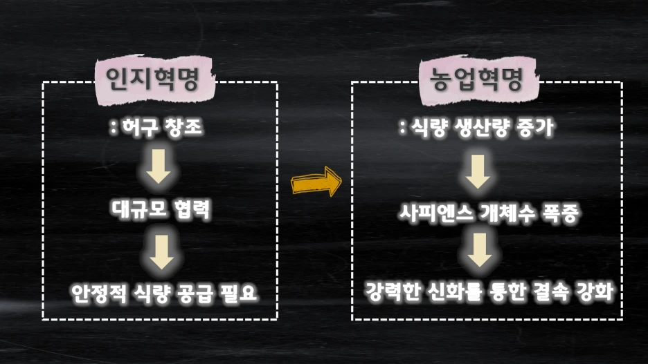 앞선 내용을 간추리면 사피엔스는 인지혁명을 통해 허구를 지어내는 능력을 갖게 됐고 이는 사피엔스로 하여금 대단위의 협력을 가능케 했습니다. 또한 대규모의 사피엔스들이 모이게 되자 안정적인 식량 공급이 요구되었으며 이는 농업혁명을 통해 해결되었죠. 나아가 농업혁명은 식량 생산량을 크게 늘리며 인구의 폭발적인 증가를 초래했습니다. 그 결과 사피엔스는 수많은 사피엔스들을 효과적으로 결속하기 위해 화폐와 제국, 그리고 종교라는 신화를 창조하죠. 이리하여 사피엔스는 커다란 <상상의 질서>를 살아가게 된 것입니다.