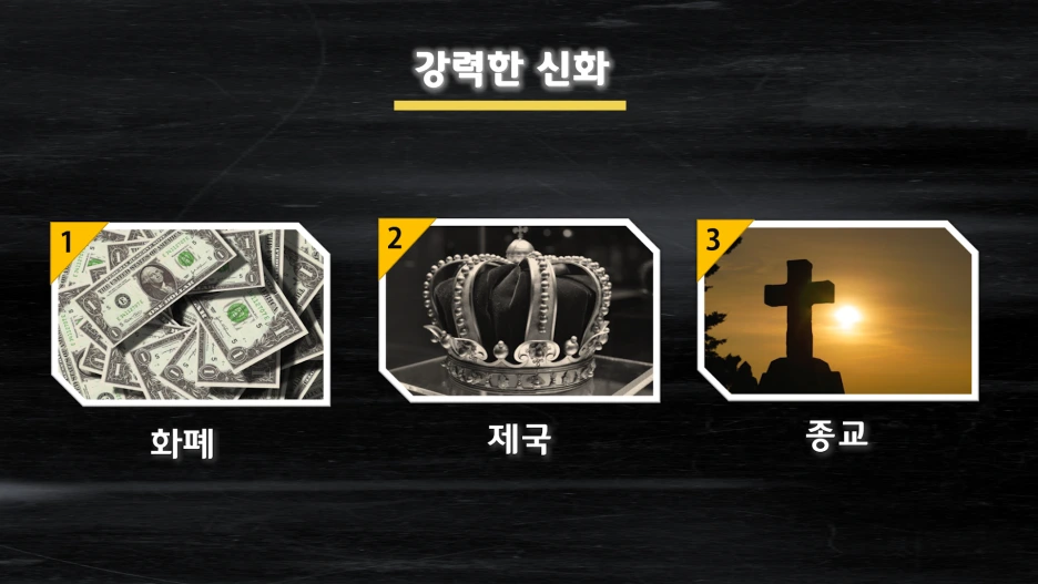 언어혁명을 통해 신화를 공유하게 된 사피엔스는 다른 사피엔스들과 협력하여 집단을 이루게 됩니다. 시간이 흐름에 따라 집단의 규모는 더욱 커졌고, 그리하여 많은 사람들이 한 곳에 모여 살게 되자 식량이 부족해졌죠. 이때 농업혁명이 등장합니다. 농경에 눈을 뜨게 된 사피엔스는 수렵과 채집으로 하루하루를 연명하던 이동생활을 접고, 한 곳에 머무르며 작물을 재배하고 가축을 기르는 정착생활을 시작하죠. 이러한 농업혁명의 특이점은 단위토지당 생산량을 비약적으로 증가시켰다는 것입니다. 말 그대로 식량은 폭발적으로 증가했고, 그 결과 사피엔스의 개체수는 기하급수적으로 불어났죠. 하지만 유감스럽게도 식량이 증가했다는 사실은 그들의 삶의 질이 향상됐음을 의미하지 않습니다. 식량은 늘었으나, 개인의 몫은 줄었기 때문이죠. 그 주요한 원인 중 하나는 바로 <계급>이라는 신화에 있습니다. 농업혁명 이후 사피엔스 집단은 그 규모가 커짐에 따라 그들 사이의 관계를 조정하고 중재할 권력과, 또 막대한 양의 식량을 나누기 위한 구심점이 필요했습니다. 이 과정에서 계급이라는 신화는 그러한 역할들을 효과적으로 수행했죠. 요컨대 계급은 엘리트 계층의 권력을 정당화해주는 이념적 수단이 되었으며, 하층민들은 자신이 태생적으로 천하다는 계급 신화를 받아들이며 터무니없이 적은 식량을 운명이라고 받아들이게 됩니다. 만약 계급 신화를 의심하는 하층민이 있다면 지배 세력은 군사력을 이용하길 주저하지 않았죠. 물론 폭력만을 앞세우는 신화는 오래도록 유지될 수 없습니다. 보다 강력한 신화는 <상상의 질서>를 진심으로 믿고 따르는 사람을 필요로 하기 때문이죠. 따라서 농업혁명 이후 대규모 사회가 번성함에 따라 더욱 강력한 신화가 요구됩니다. 하라리는 그 대표적인 신화로 다음의 세 가지를 제시합니다.