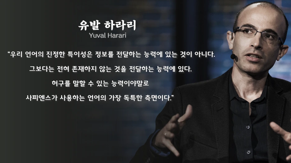사피엔스의 언어가 가지는 특이성을 <존재하지 않는 것을 전달하는 능력>에서 찾은 유발 하라리의 관점은 스위스의 언어학자 소쉬르의 말을 떠오르게 합니다. 소쉬르는 다음과 같이 말했습니다. “기표와 기의의 관계는 자의적이다.” 가령 '바라만 봐도 심장이 쿵쾅거리고 설레는 뜨거운 마음'을 기의(시그니피에)라 가정하자면, 기표는 이를 표시하는 언어 기호, 즉 ‘사랑’이라는 두 글자입니다. 이 둘의 관계가 자의적이라는 소쉬르의 말은 쉽게 말해 우리의 뜨거운 마음이 반드시 ‘사랑’이라고 불릴 이유가 없다는 이야기이죠(어떤 드라마에서는 '사랑' 대신 '무지개'라는 말로 바꾸자고 제안하는 장면도 있더군요). 하지만 어찌됐든 우리는 ‘사랑해’라는 상대방의 말에서 감동을 느끼곤 합니다. 이는 ‘사랑’이라는 두 글자가 실은 아무 의미도 없는 기표에 지나지 않는다는 사실에 대한 불신을 유예할 때 가능한 거죠. 만약 우리가 모든 단어들에 대해 그것의 진의를 따지고 들자면 정상적인 의사소통은 불가능할 것입니다. 즉 우리는 기표와 기의의 관계에 대한 불신을 유예함으로써, 바꿔 말하면 언어의 허구성을 일정 부분 인정함으로써 의사소통에 성공할 수 있는 것입니다.