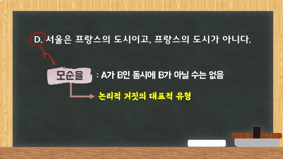 주어진 명제는 조금이라도 참이 될 가능성을 갖고 있지 않습니다. 서울이라는 단일한 주체가 프랑스의 도시인 동시에 프랑스의 도시가 아닐 수는 없기 때문이죠. 이처럼 논리적 거짓이란 그 명제의 논리적 형식이 결코 참일 가능성을 갖지 않음을 뜻합니다. 따라서 논리적 거짓은 항상 거짓임을 뜻하는 항위명제라 불리기도 하죠. 참고로 앞서 살펴본 D명제의 형식을 논리학에서는 모순율이라 합니다. 쉽게 말해 모순율이란 A라는 것이 B인 동시에 B가 아닐 수 없음을 뜻하는 논리학 법칙으로, 논리적 거짓의 대표적인 형식이라 할 수 있죠.
