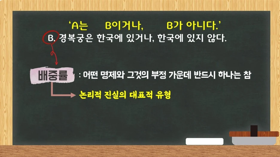 명제B의 형식은 논리적으로 거짓일 가능성이 존재하지 않습니다. 경복궁이라는 단일한 주체는 한국에 있거나 있지 않거나 둘 중 하나를 반드시 만족해야 하기 때문이죠. 이처럼 논리적 진실이란 그 명제의 논리적 형식이 결코 거짓일 수 없는 사태를 뜻하는 것입니다. 이러한 논리적 진실은 항상 진실이라는 의미에서 항진명제라 불리기도 하죠. 참고로 B명제의 형식을 논리학에서는 배중률이라고 설명합니다. 배중률의 사전적 정의는 ‘어떤 명제와 그것의 부정 가운데 반드시 하나는 참이어야 하는 법칙’을 뜻하는 것으로, 즉 ‘A는 B이거나, B가 아니다’라는 명제는 반드시 참이라는 뜻이죠. 따라서 배중률은 논리적 진실의 대표적인 형식 중 하나라고 정리할 수 있습니다.