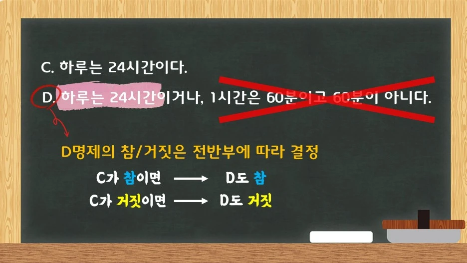 먼저 D명제의 후반부를 살펴보면 1시간은 60분이고 60분이 아니라는 설명은 모순율의 형식으로서, 즉 논리적 거짓에 해당합니다. 따라서 D명제가 참이기 위해서는 전반부에 해당하는, 즉 ‘하루는 24시간이다’라는 명제가 참이어야 하죠. 다시 말해 D명제의 참/거짓은 ‘하루는 24시간’이라는 전반부 내용에 달려 있다는 것입니다. 그러므로 C가 참이라면 D도 참이며, C가 거짓이라면 D도 거짓일 수밖에 없죠. 이처럼 항상 동일한 진리값을 공유하는 관계를 논리적 동치라 합니다.