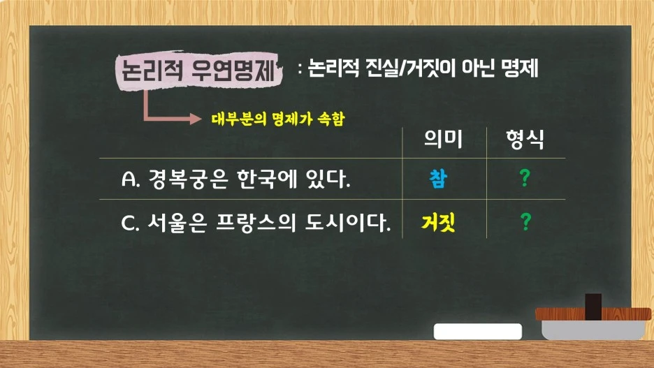 물론 의미의 관점으로 두 명제를 바라본다면 A명제는 명백한 참이며, C명제는 명백한 거짓입니다. 하지만 형식의 관점으로 본다면 두 명제는 논리적 진실도, 논리적 거짓도 아니었죠. 이처럼 논리적 진실도 논리적 거짓도 아닌 명제를 논리적 우연명제라 부릅니다. 사실상 거의 대부분의 명제들이 속하는 영역이라 할 수 있죠.