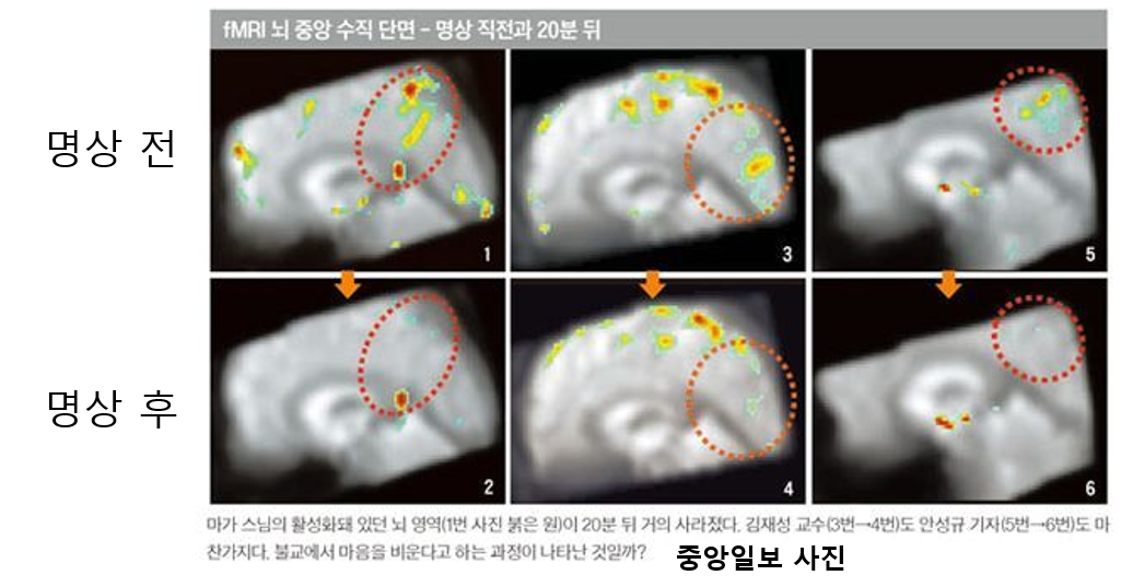 명상을 오래 습관적으로 한 사람일수록 이 휴업 상태가 빨리 잘 된다. 그리고 명상 종류로는 호흡에 집중하는 집중명상들이다. 아래는 예전 중앙일보 기사에 나온 fMRI 뇌 사진이다. 명상을 하기 전에 활성화되어 있던 영역들이 비활성화되어 가는 것을 확인할 수 있다.