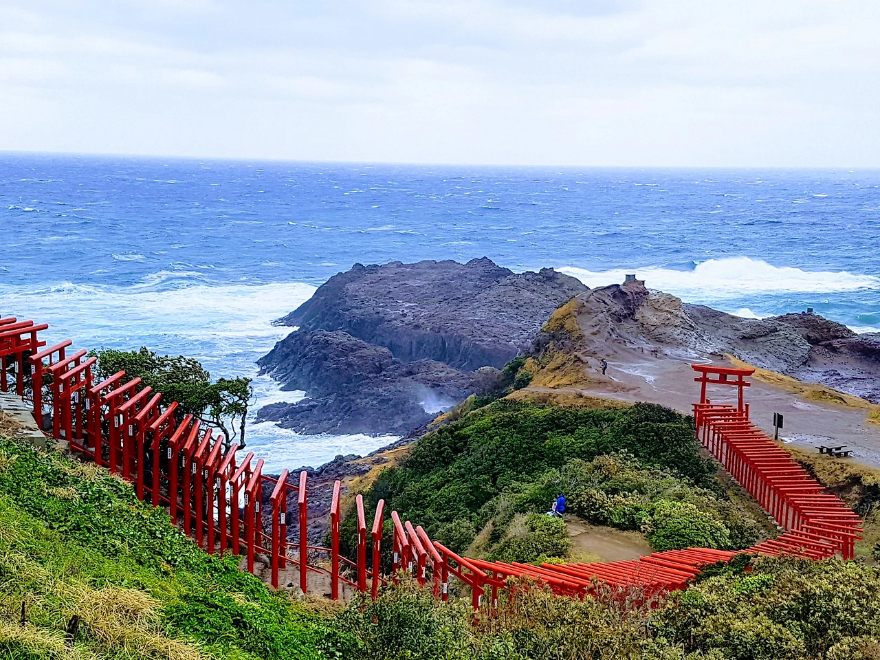 이곳의 명소 모토노스미 이나리 신사는 그 절벽과 해안을 극적으로 품고 있다. 붉게 칠해진 도리이 123개가 해안선을 따라 굽이치며 이어지고, 그 아래에는 파도가 하얀 거품을 부서뜨리며 끊임없이 밀려온다. 이곳은 신을 모시는 공간이면서 동시에 바다와 땅, 인간이 오래도록 맺어온 관계와 믿음이 눈앞에 펼쳐지는 장소였다.