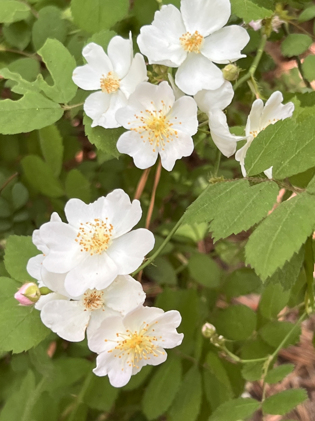 다시 걷는다. 해발 70m밖에 되지 않는 자그맣고 야트막한 산에 듣지도 보지도 못한 나무와 꽃이 핀다. 요즘 핫한 꽃은 찔레꽃인 듯싶다. 하트모양을 한 하얀색 꽃잎 네 장, 노란색으로 수술암술이 “벌들아 여기야~ 어서 와” 하는 것처럼 존재감 드러내며 위로 솟아있다. 흰색과 노랑의 색 조합, 거기에 초록색 잎사귀까지. 자연은 어느 유명 화가 못지않은 색감을 지니고 있다. 이 색을 누가 흉내 낼 수 있을까 작은 탄성이 절로 나온다. 찔레꽃 사진도 찍고 끙차 하며 다시 길을 나선다.