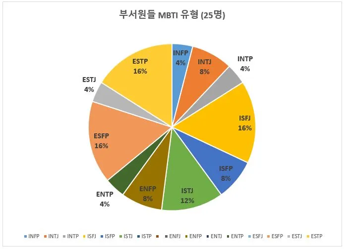 재미로 우리 부서원 중 25명을 대상으로 간이 mbti 검사를 해봤더니 제법 골고루 나왔다. 그래서 이렇게 부서가 다이나믹한건가..ㅎㅎ