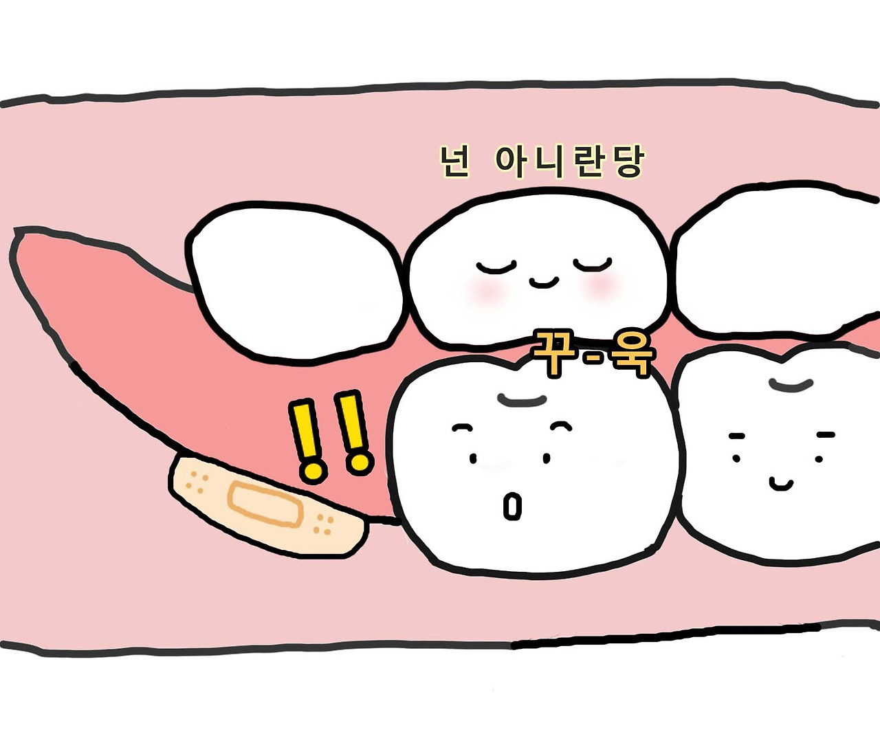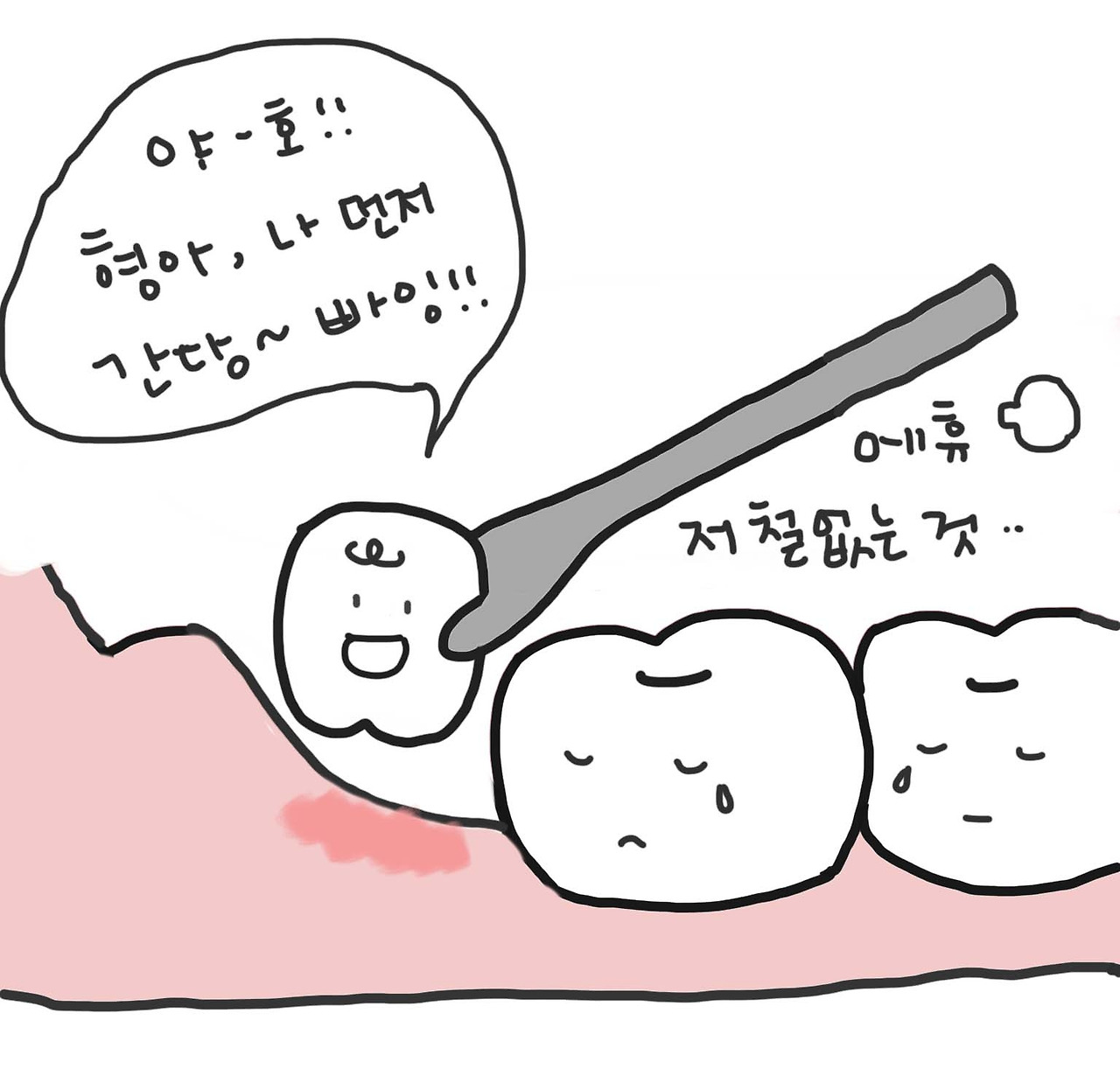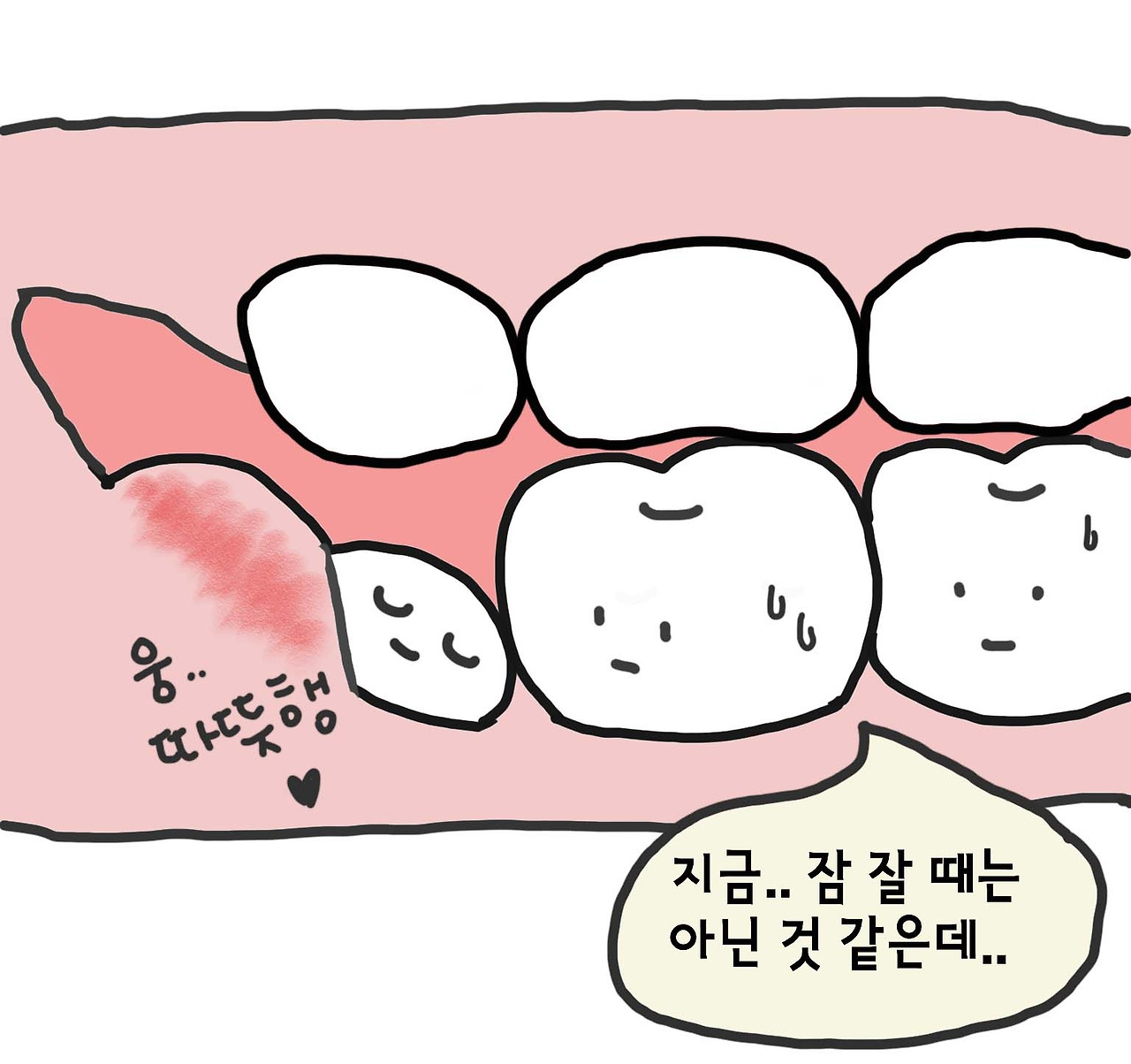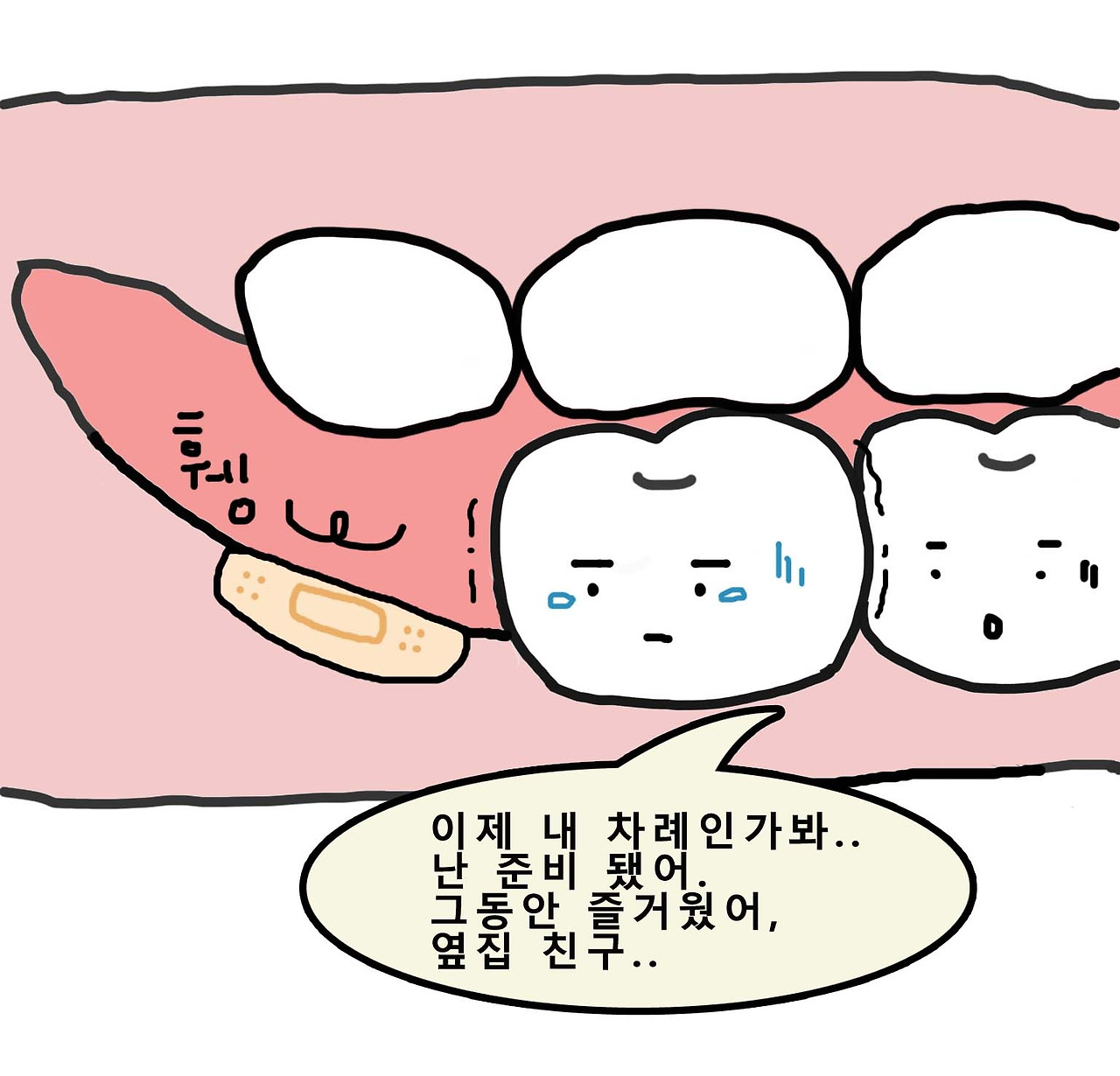 실밥을 뽑은 지 일주일이 지난 지금, 발치 후 입안에서 느껴지는 미묘한 느낌들이 신기해 그림일기로 남겨보았다.