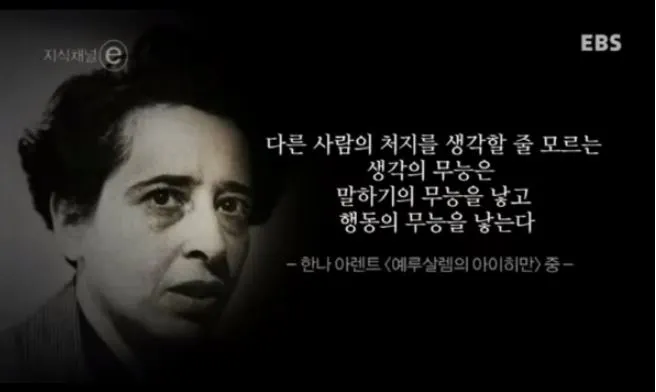 출처. EBS 지식채널e현실에는 히어로물에 나오는 악당이 없다. 카페나 편의점 직원에게 하대하며 막말하는 아줌마도 집에가면 자기 강아지를 챙기는 사람일 수 있고, 직장에서 딸벌인 여직원에게 성희롱을 일삼고 남직원들에게 인격모독 발언을 하는 사람도 집에서는 좋은 남편, 아빠의 역할을 하고있을 수 있다. 이처럼 타인에게 많은 악행을 저지르면서도 '관행' '상사의 지시' 같은 말 뒤에 숨는 사람들은 해오던대로 똑같이 했을 뿐이라고 변명을 하겠지만, 그 자체가 죄악이 된다. 타인의 입장에서 생각하지 못하는 무능, 자기가 무슨일을 하고 있는지 전혀 깨닫지 못하는데에 '악의 평범성'이란 특징이 있는 것이다.