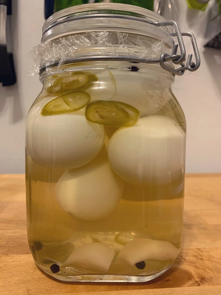 번외 편 계란 피클. 풍문으로 존재만 알던 식품인데 담가보았다. 놀랍게도 맛있다. 샐러리 씨앗과 통후추, 그리고 비릴까 봐 청양고추 대체재로 주로 사용하는 세라노 페퍼 Serrano Pepper를 씨앗을 털고 식초 물에 넣어 끓였다. 특별한 이유를 찾지는 못했지만, 염장이 아니라서 그런지 완전히 익힌 계란 Hard-boiled을 쓰는 것이 일반적인 모양이다. 야채 피클과 같은 방법으로 병에 삶은 달걀을 담은 후, 지나치게 익는 것을 방지하기 위해 식초 물을 약간 식힌 후에 병에 부어 48시간 냉장 보관 후에 꺼내 먹었다.
