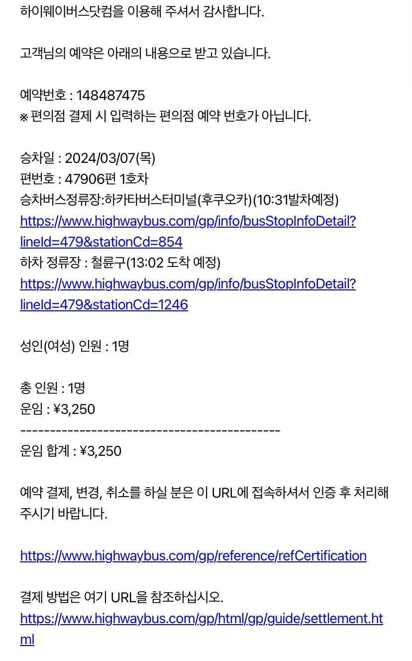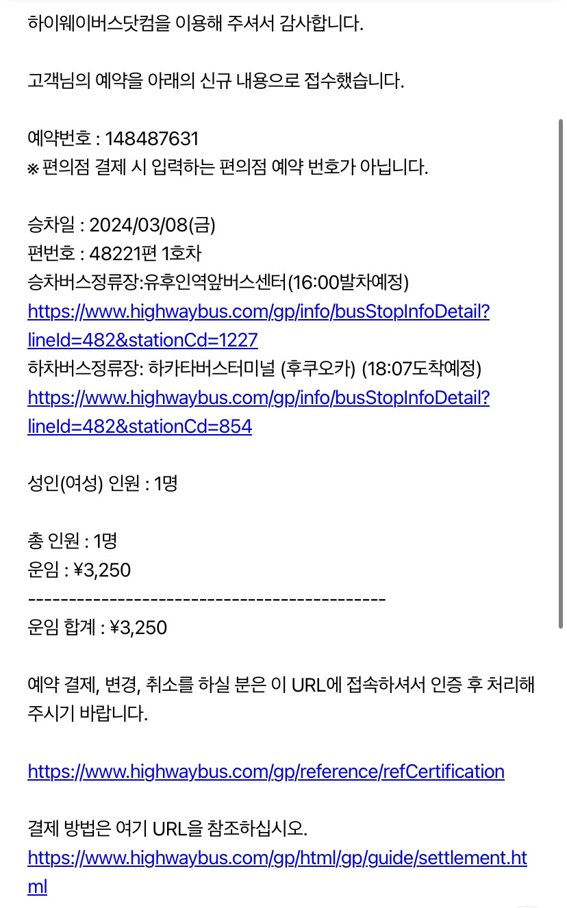 국내 여행 사이트에서 적당히 가격 괜찮은 곳으로 산큐패스를 구매한 다음 좌석을 예약해도 되고 좌석을 먼저 예약하고 구매를 진행해도 상관없다. 예약을 하면 이메일을 받을 수 있는데 이걸 나중에 산큐 패스 교환할 때 같이 제시하면 좌석표를 함께 받을 수 있다. 나는 하카타에서 벳푸로 가는 버스와 유후인에서 하카타로 돌아오는 버스로 예약했다.