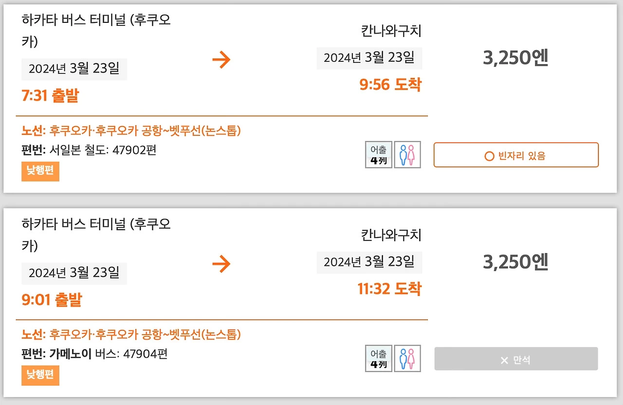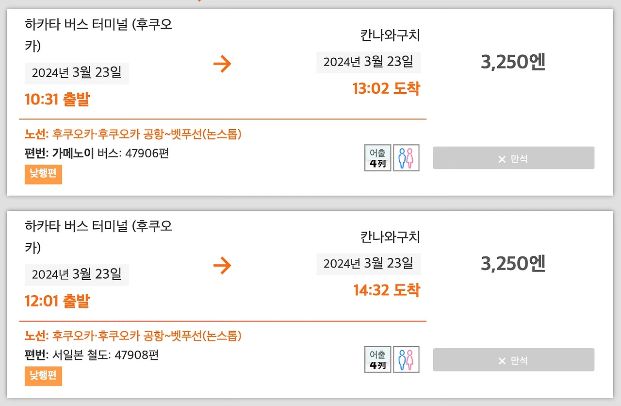 유후인으로 바로 가는 일정이었다면 도시락 사서 유후인노모리에서 낭만 있게 창문을 보면서 유후인에 가려고 했는데 벳푸로 행선지가 변경되니 기차를 탈 이유가 없어져 버렸다. 거기에 사전 구매를 하려고 보니 벳푸로 가는 시간대도 많이 없어 일찌감치 포기했다. 사실 유후인노모리도 이미 예약이 가득 차서 탈 수가 없었고 대신 유후인 특급 열차로 이동해야 했다. 그것도 좋을 거 같았지만 서울에서 부산 가는 KTX를 지겹도록 탄 입장에서 왠지 평범한 기차는 구미가 당기지 않았다. 그래서 곧바로 버스에 대해 찾아보았다.