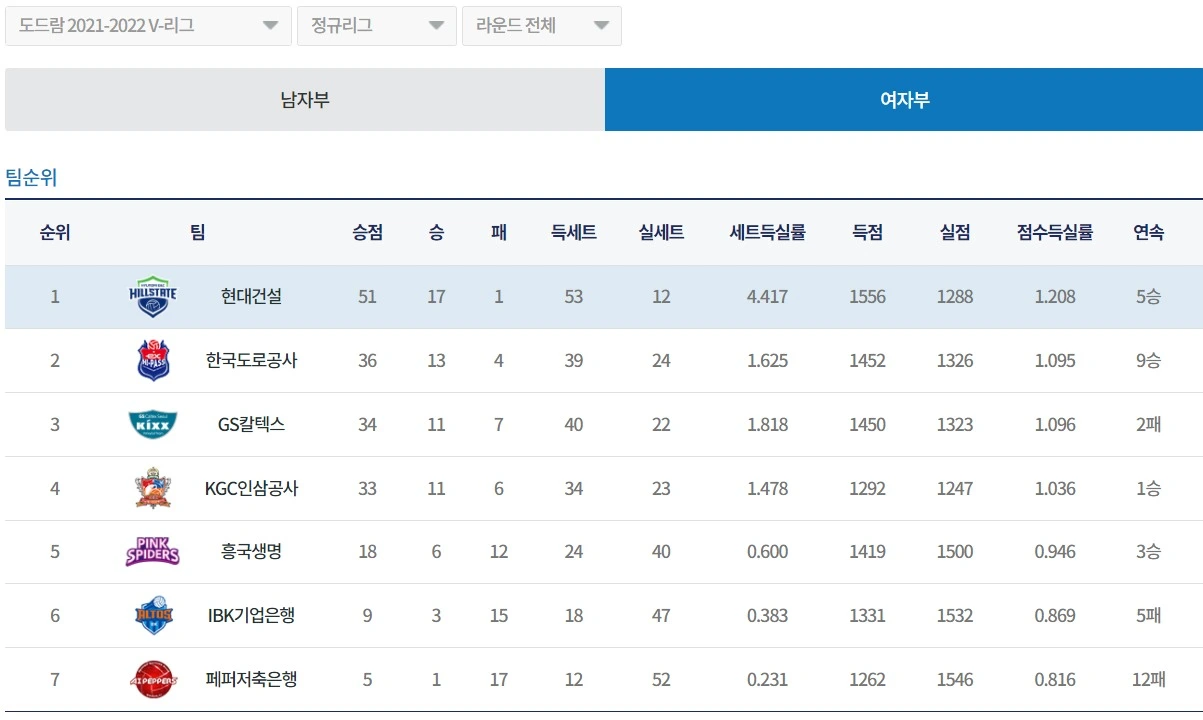 여자배구 V리그 12월 4주 차까지 순위