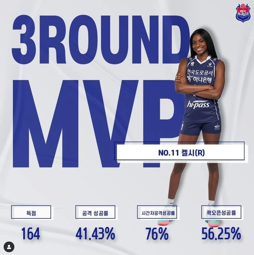 여자배구 V리그가 반환점인 3라운드를 마치고 4라운드에 접어들었습니다. 3라운드 MVP는 한국도로공사의 외국인 선수 켈시 페인에게 돌아갔습니다. 켈시는 이번 시즌 여자배구 구단 중에서 유일하게 원 소속팀인 한국도로공사와 재계약한 외국인 선수입니다. 재계약을 결정한 구단의 안목을 증명이라도 하듯이 이번 시즌 엄청난 활약을 보여주고 있습니다. 한국도로공사 11연승의 중심에 켈시 선수가 있고, 3라운드 MVP에 선정됐습니다.
