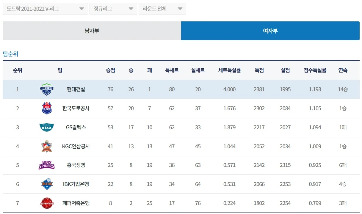 여자배구 V리그 현재까지 순위 / 이미지 출처 : KOVO 한국배구연맹 홈페이지