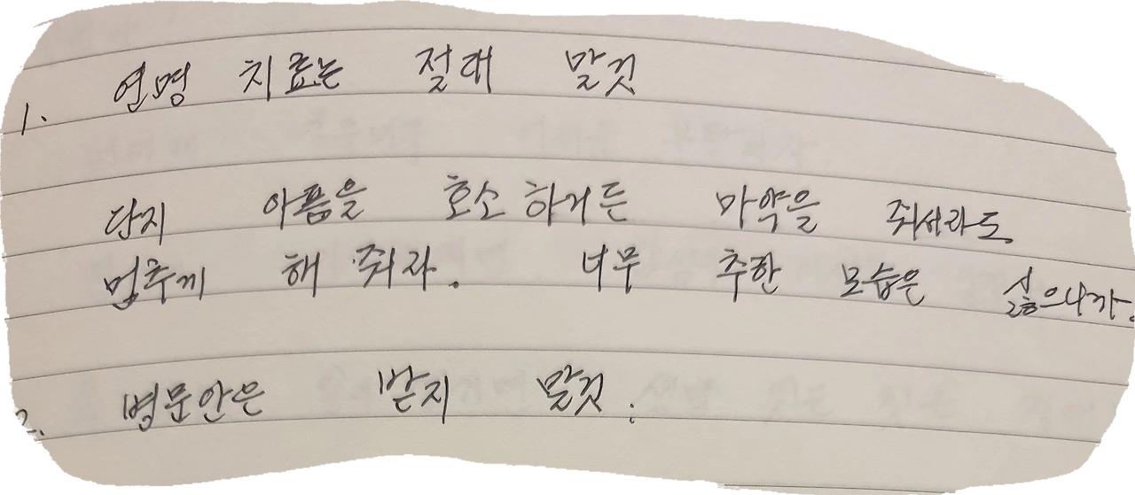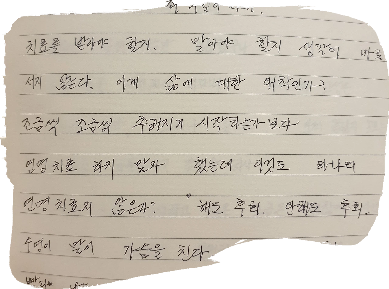 그러나 항암 단계에 가서는 혼자 할 수 있는 건 없었다. 독한 약 때문에 침대에서 제대로 일어나지도 못하던 어느 날, 처음으로 이런 말을 하셨다. "이렇게 살아서 뭐 해." 두 번의 항암, 그리고 전이. 어머니는 더 이상의 치료는 안 하시겠다며 의사에게 당부했다. "마취약은 많이 써 달라. 아픈 거 싫고, 무엇보다 정신줄 놓아 자식들 고생시키기 싫다." 이후 어머니의 하루 24시간은 자신의 것이 아니었다. 그렇게 80년 인생이 마감했다.