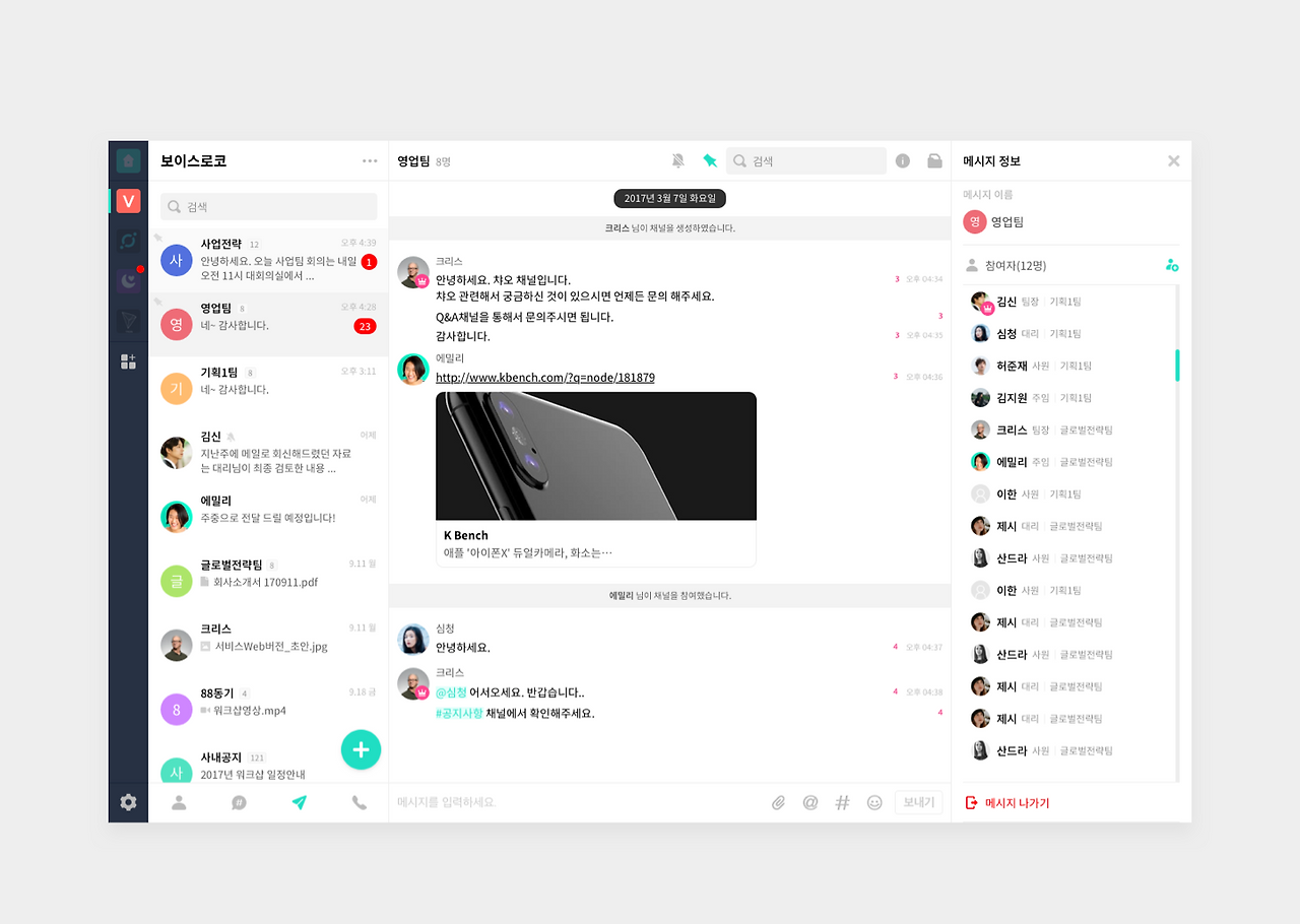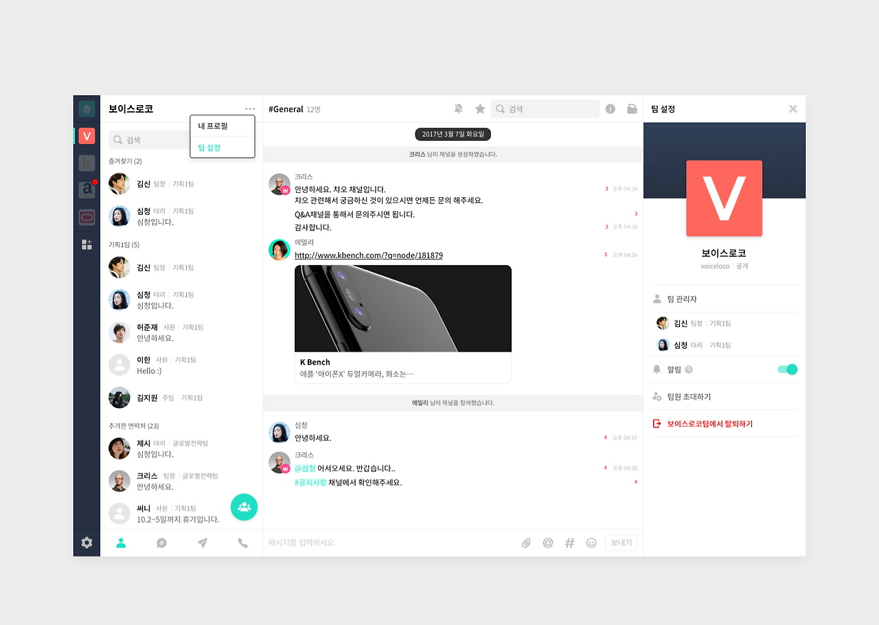 왼쪽 사이드에 팀 UI 영역을 마련해 유저가 가입된 팀의 심볼(아이콘)로 빠르게 팀스위칭이 가능 하도록 하였습니다.