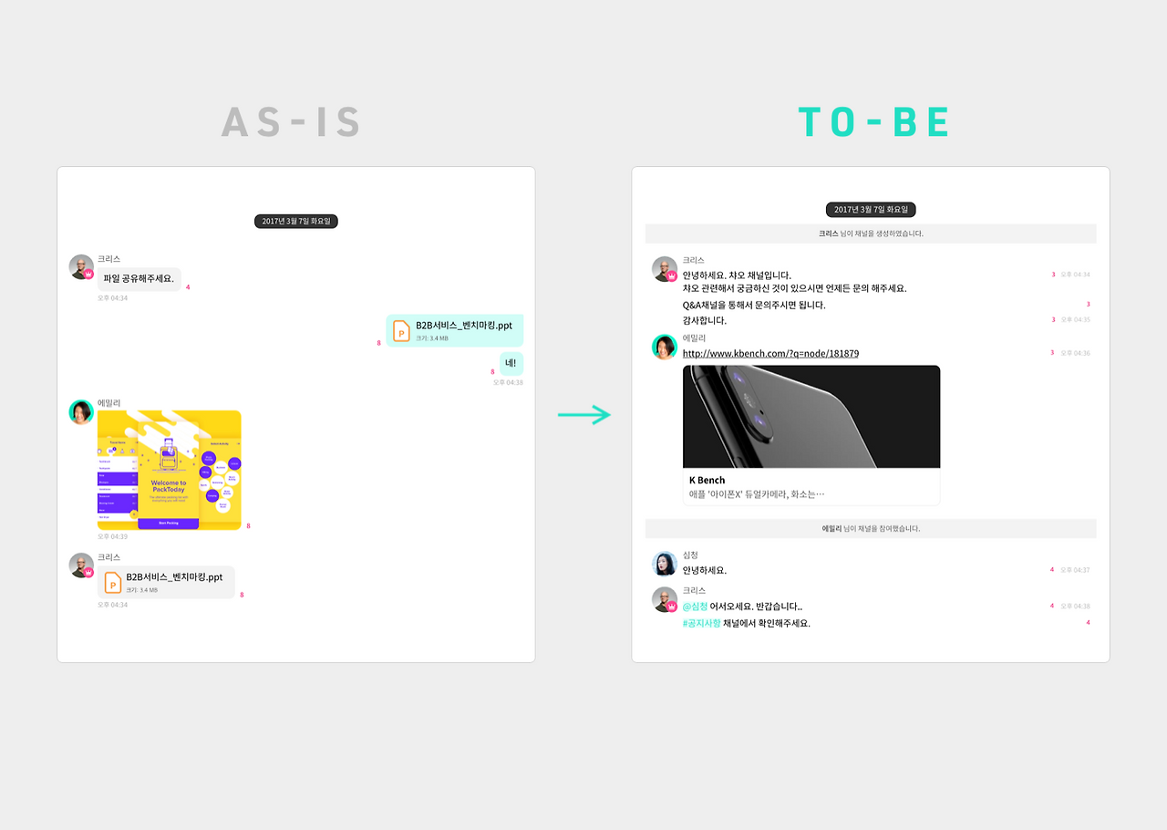이 부분을 해결하기 위해 당시 슬랙과 같은 업무용 협업 커뮤니케이션 툴들의 스레드 UI처럼 우리도 추후 연결될 외부 응용프로그램들과의 확장성에 대비해 말풍선 UI에서 스레드 방식의 Chat UI를 도입하기로 하였습니다.